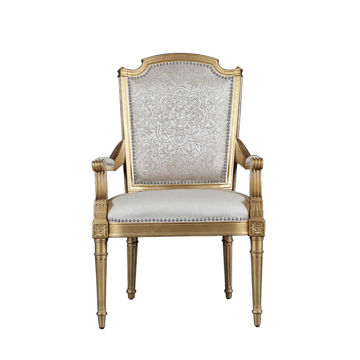 赫普爾懷特風格的盾形背搭配車織雕刻腿比例優美,造型優雅,兼有古典式的華麗和路易十六式的纖巧。描金工藝與淡黃色軟裝布藝的交織,是自然的色彩密碼與權利至上的象征。