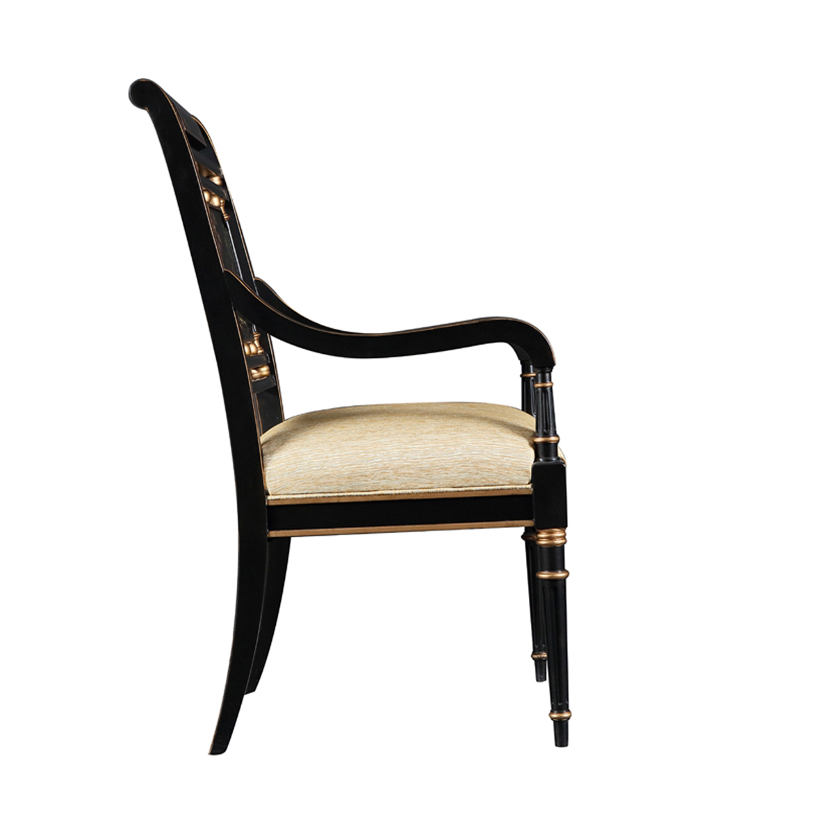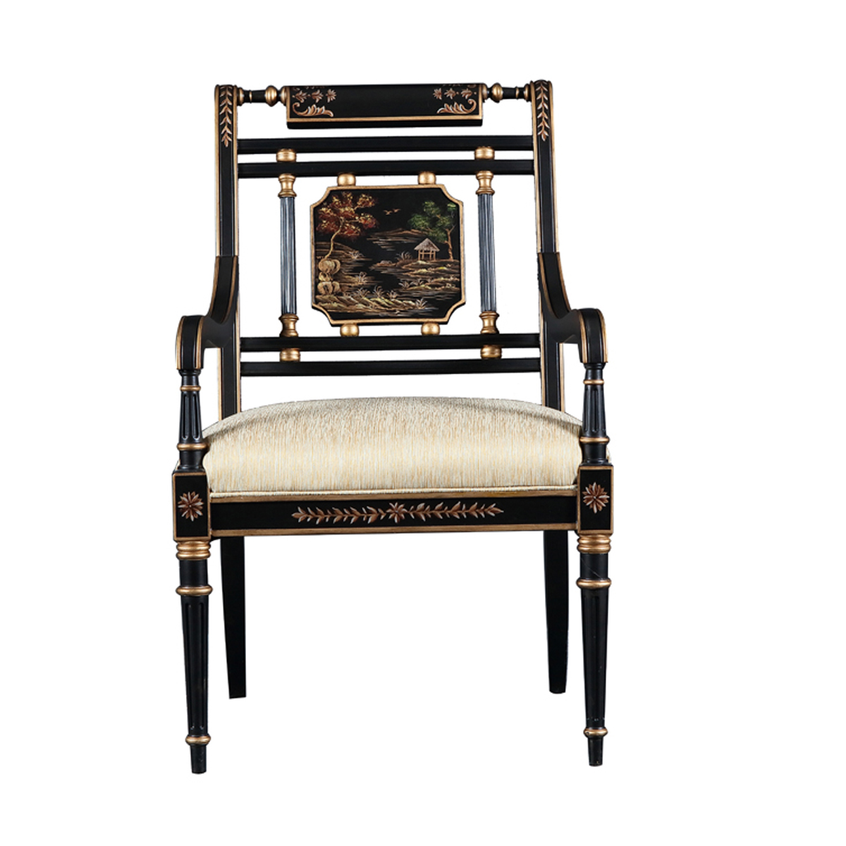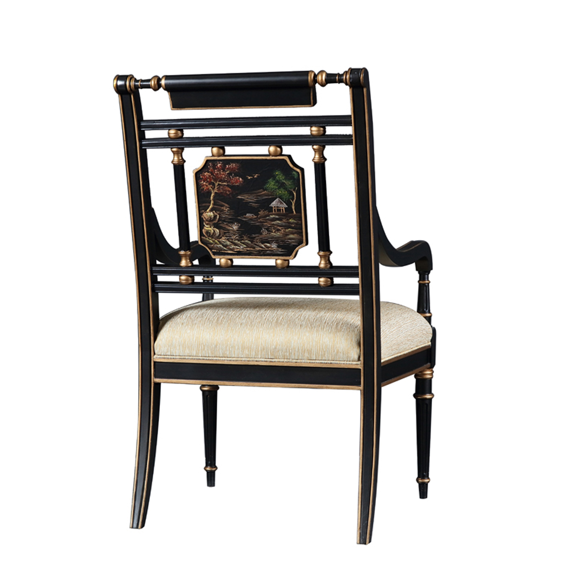 黑錚發亮的家具上描以金黃色的山水圖畫,婉然掛著一幅名家的山水畫。配合極具英式文化精髓的謝拉頓椅腳及鏤空造型,讓整個空間協調,充分展示了中西家居文化相互糅合的設計創意。