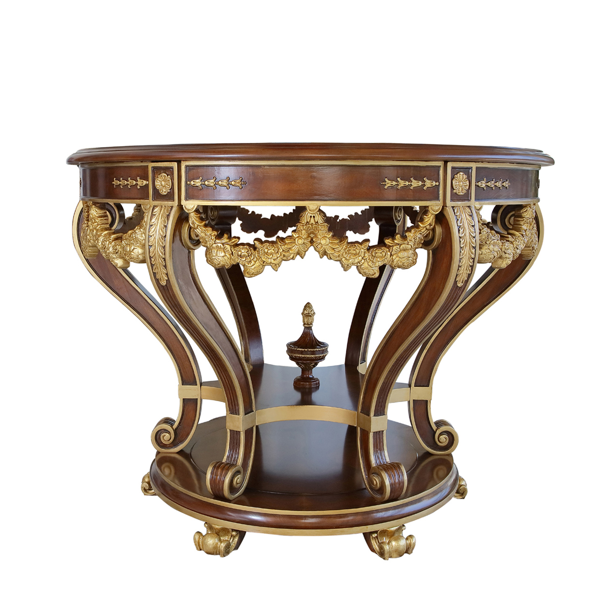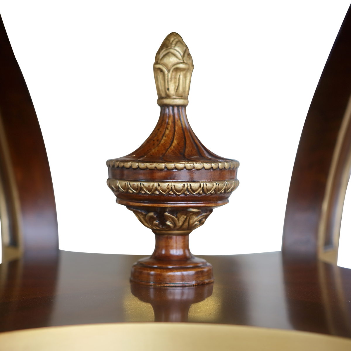 為表現英國皇室的華麗和莊嚴,以英國溫莎堡為設計元素。使用雕刻描金葉飾花紋,表現出英國王室的典雅氣質,配上代表勝利的旋渦狀支撐柱、精致的手工雕刻細節和貼金箔工藝,完美演繹了英式宮廷家具的奢華尊貴,可謂是極具典藏價值的傳世之作。