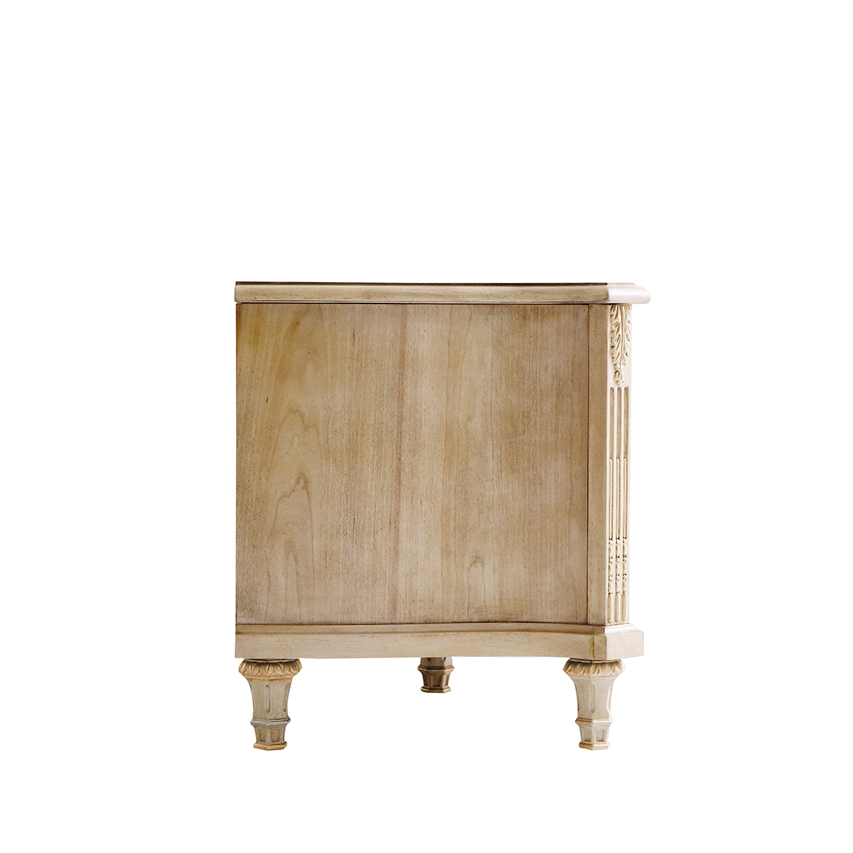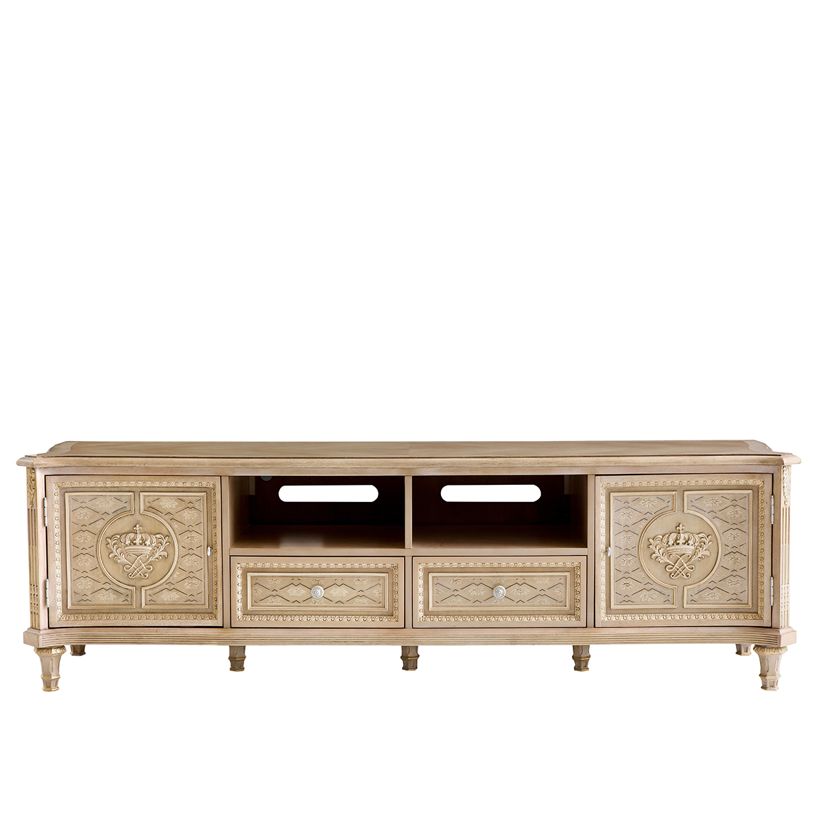 * 手工雕刻的工藝細節,結實的連接技術; * 中間兩個儲物抽斗配有CD/DVD隔板,可CD/DVD更好的存放,其底部采用經典硬木實木滑軌設計; * 兩扇門內各有1塊可調層板;上部為開空設計,可在內放播放器等電子器材; * 腳底部裝有可調腳釘;