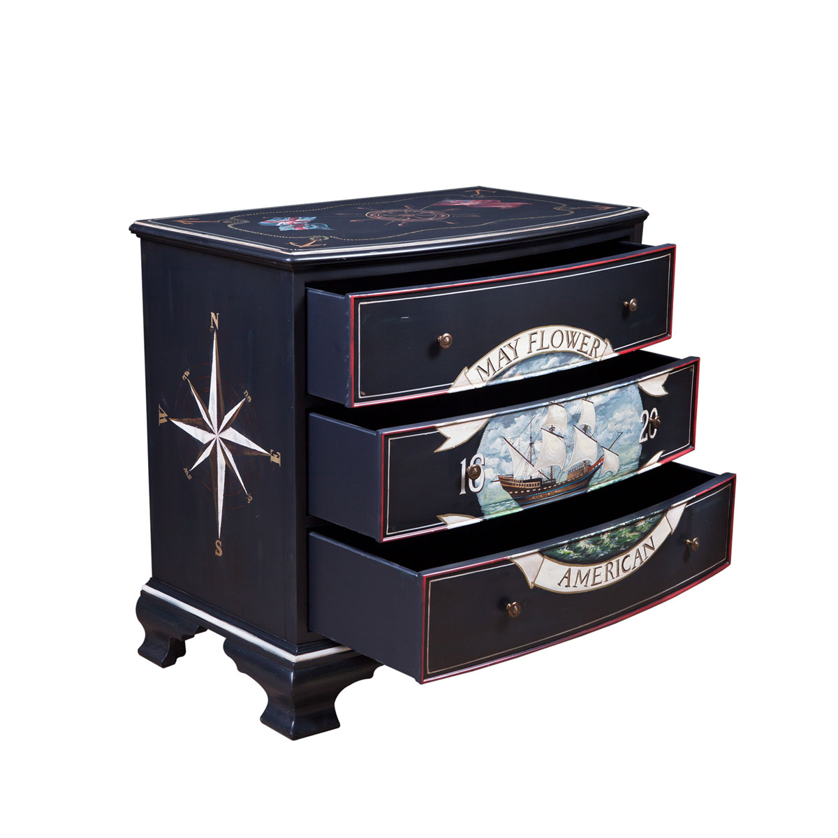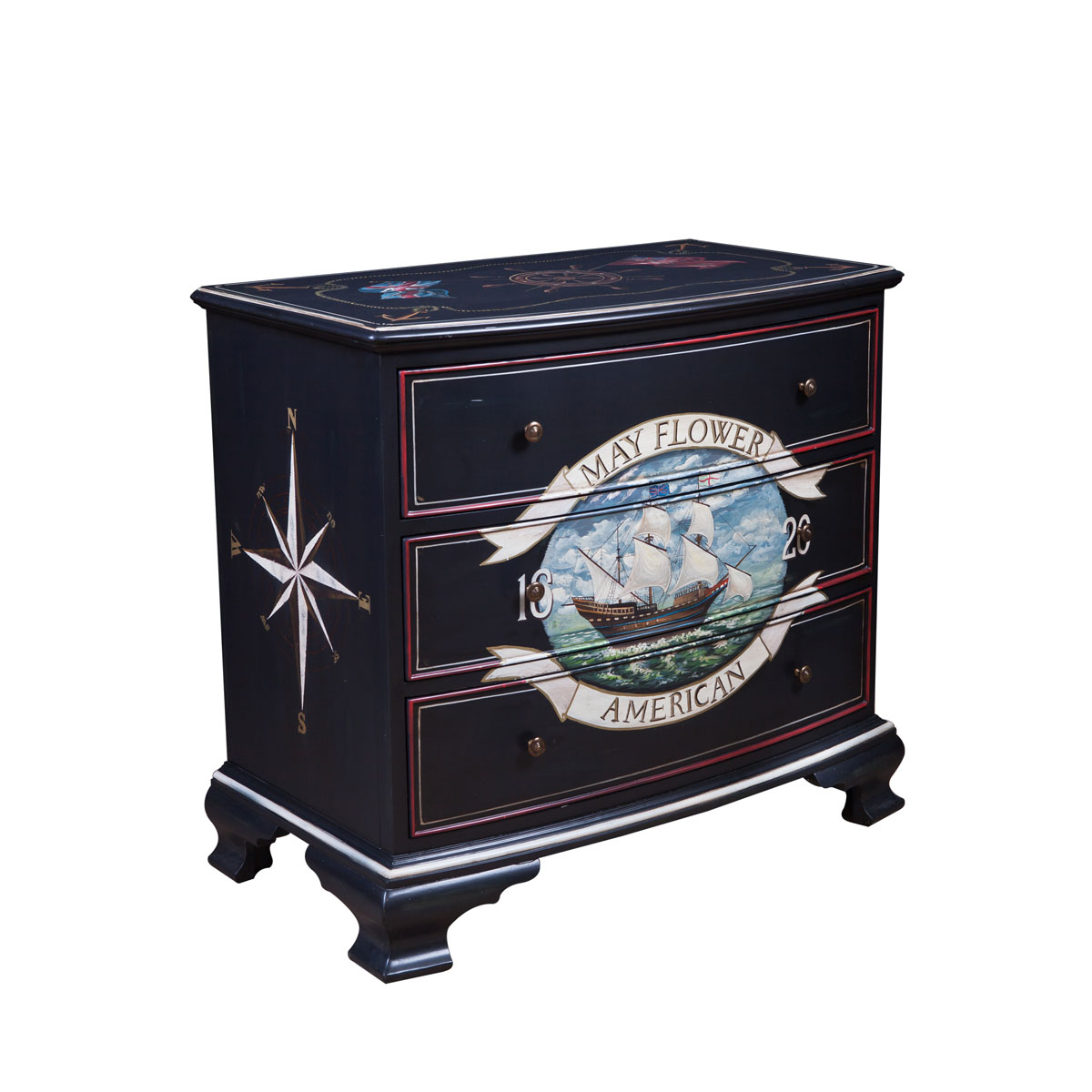 * 代表自由的五月花號不單只把不同地方的文化帶到美洲大陸,更把不同國家的風格帶到這里。如使用航海元素的手繪工藝配搭經典的黑色油漆,黑色油漆來至于中國風水中的黑色,是北方和“水”的象征,自古有水能生財一意,充分表現了美國果敢堅毅的開拓精神與多元融合的美式家具特色