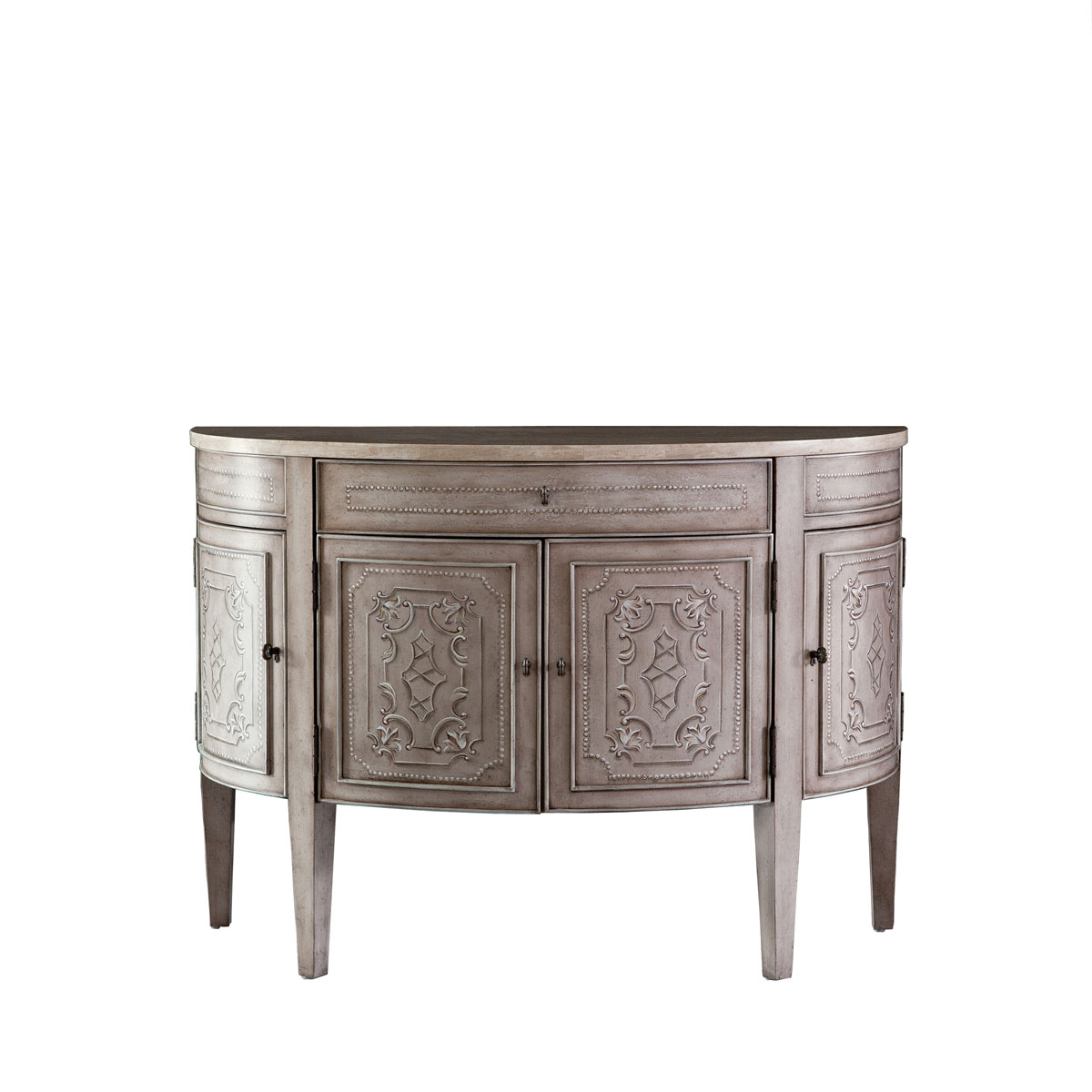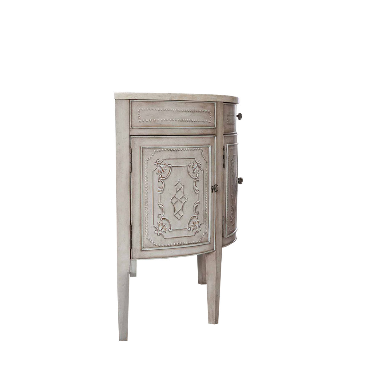 * 高貴的古銀色為這款半圓柜鍍上了一層永不過時的經(jīng)典外衣,開裂紋、明暗不一的色澤等做舊工藝留住了歲月的印跡,洋溢著古董家具的藝術(shù)風(fēng)骨;簡潔優(yōu)雅的雕刻圖案,蘊藉著耐人尋味的美學(xué)內(nèi)涵,如若傳之后世更顯光彩榮耀。