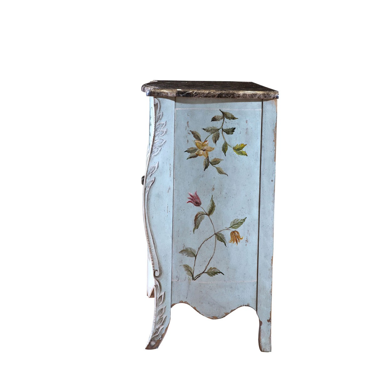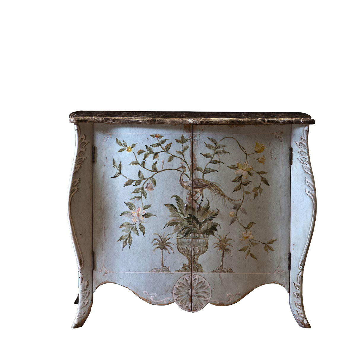 * 撕裂痕等做舊痕跡記載了祖輩點滴的幸福瞬間,描繪 了傳家之寶的神韻;百花叢中孔雀開屏的手工彩繪,古樸優雅、意趣盎然,仿佛籠罩著歲月積淀的迷人光芒;搭配深淺變化的復古色澤,此款孔雀柜猶如渾然天成的時光藝術品。
