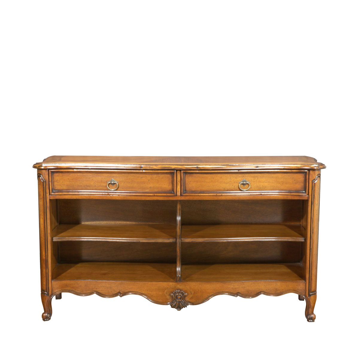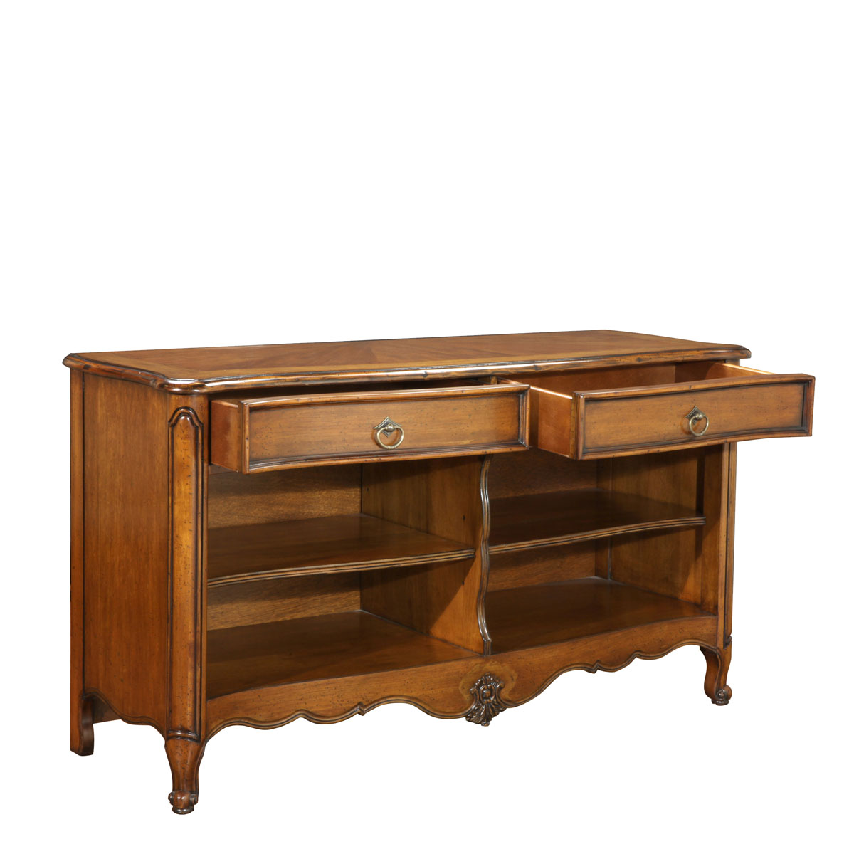 * 手工雕刻的阿坎瑟斯卷葉和攝政時期風格的彎腳設計 * 結實的連接技術 * 兩個儲物抽斗,并底部采用經典硬木實木滑軌設計;左右各有1塊可調整層板