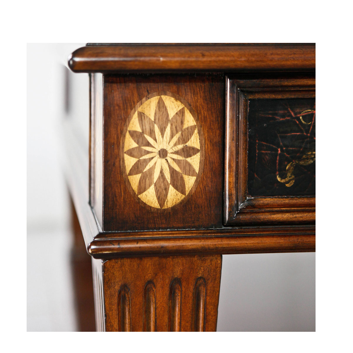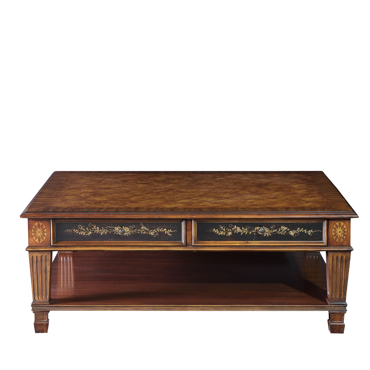 * 以18世紀(jì)英吉利——“日不落帝國”為設(shè)計(jì)主題,將東西方的多種藝術(shù)元素結(jié)合在一起。精致的木皮貼面,展現(xiàn)了高檔木材的天然紋理,帶出獨(dú)特的立體感;黑底金漆的山水手繪,頗具東方情調(diào)。配上Sheraton(謝拉頓風(fēng)格)的錐形凹槽柱和層板設(shè)計(jì),是經(jīng)典系列英吉利經(jīng)典英式長方咖啡桌的特色。
