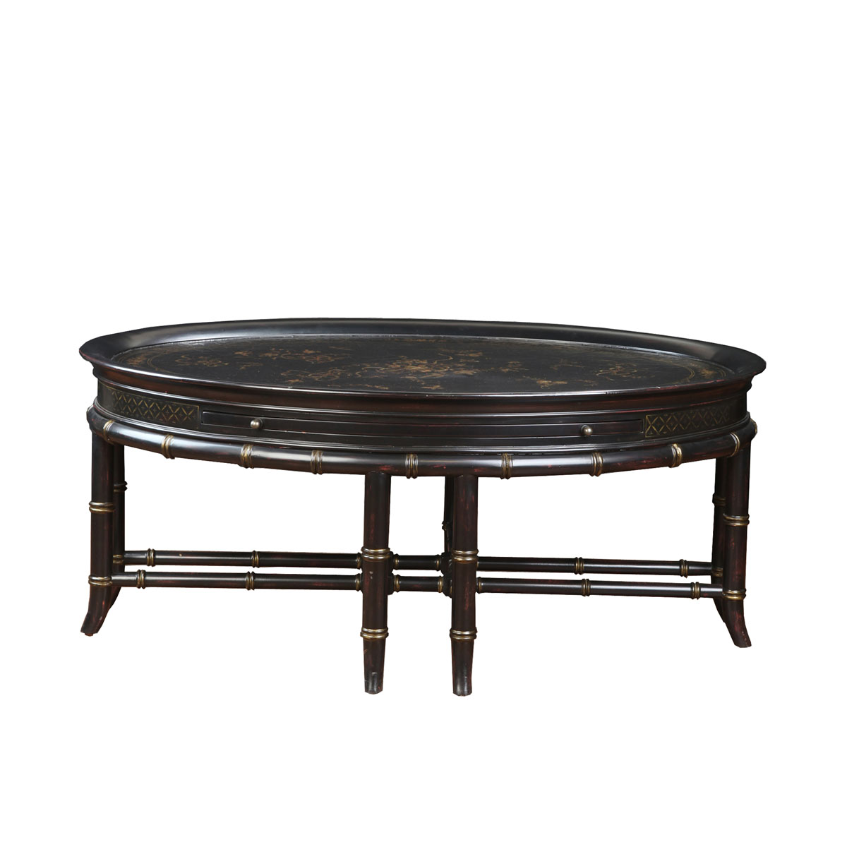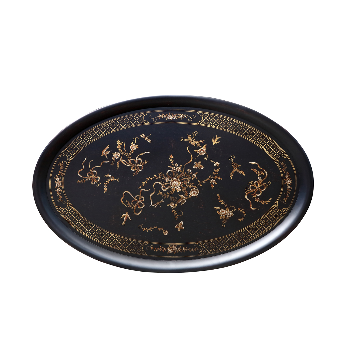 * 以18世紀(jì)英吉利——“日不落帝國”為設(shè)計(jì)主題,把東西方的多種藝術(shù)元素結(jié)合在一起。有來自東方意念的竹子造型車枳柱和高貴的黑底金漆配搭;也有參考東方山水畫的手繪植物圖案。配上托盤式面板設(shè)計(jì),是經(jīng)典系列英吉利經(jīng)典英式橢圓咖啡桌的特色。