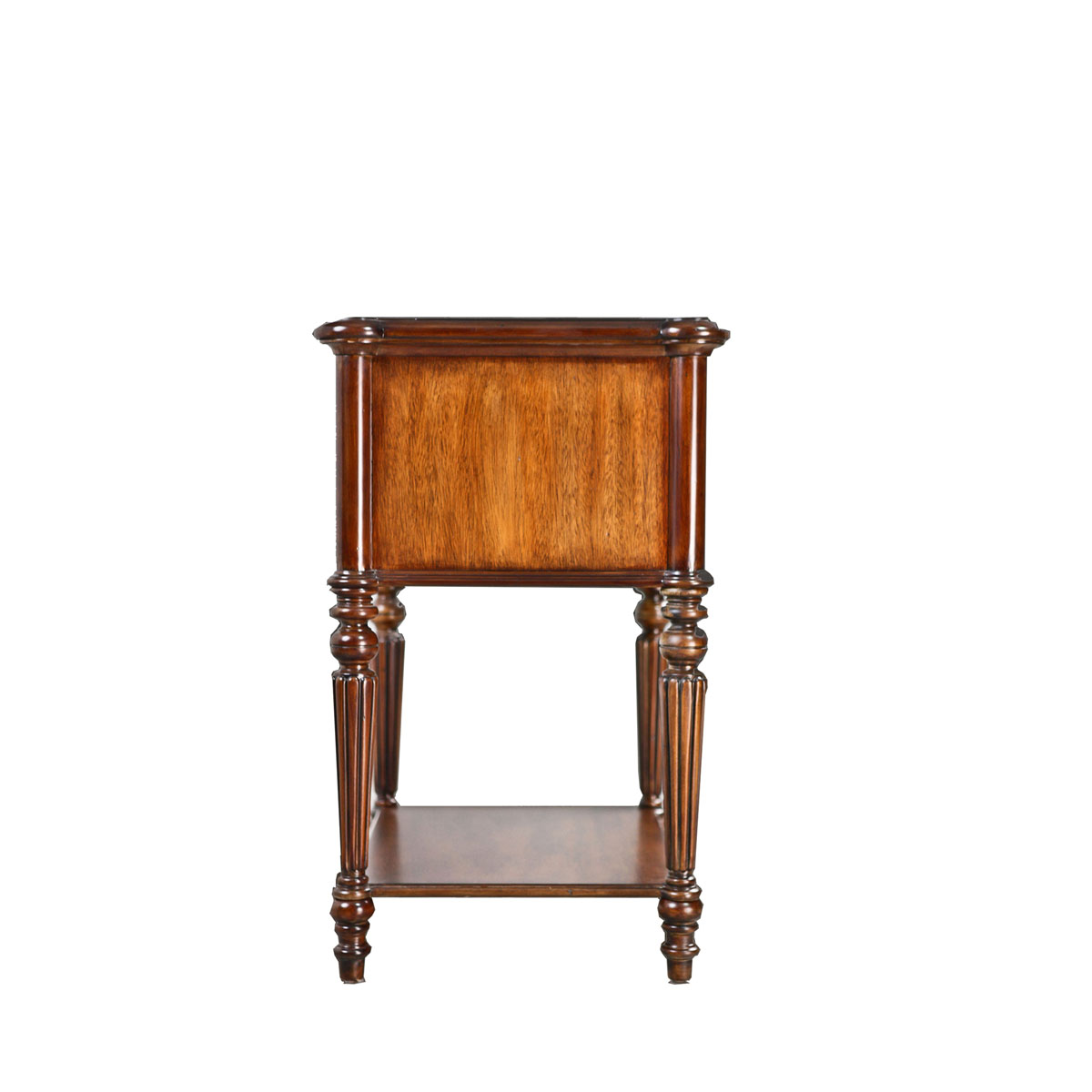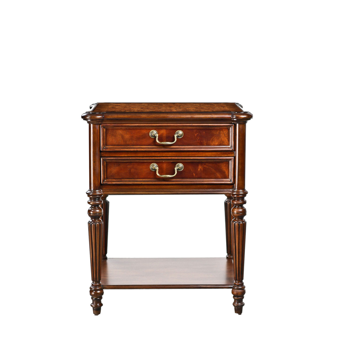 * 以18世紀英吉利——“日不落帝國”為設計主題,將東西方的多種藝術元素結合在一起。精致的木皮貼面展現了高檔木材的天然紋理,帶出獨特的立體感,厚實穩重的造型飾以仿古的涂裝,展現出經久不衰的迷人魅力;配上 Sheraton(謝拉頓風格)錐形凹槽柱、層板設計和古銅色的仿天鵝式拉手,是經典系列英吉利經典英式床頭柜的特色。