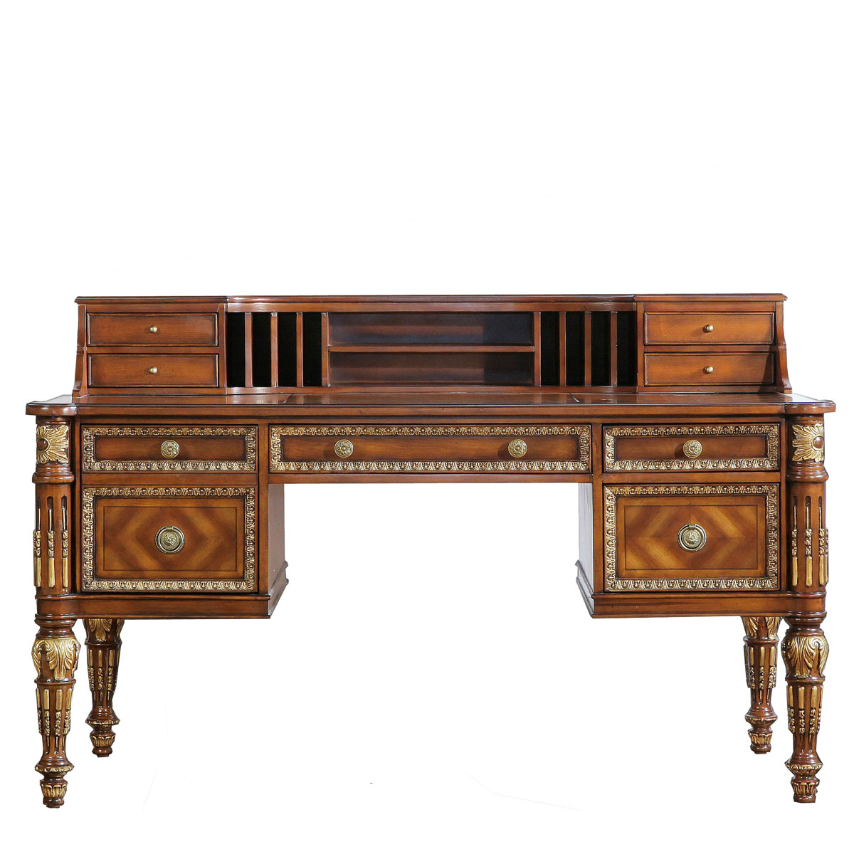 * 女主人關于美的秘密,或許只有梳妝臺知道。卷葉植物與直線凹槽裝飾的錐形腳,象征著皇室的卓越品味;華麗金箔貼飾和鉆石形拼花圖案,傳遞出奢華浪漫的專屬風格;而豐富的小抽屜與層格設計,則用實用功能向玲瑯滿目的化妝品與珍寶首飾致敬。