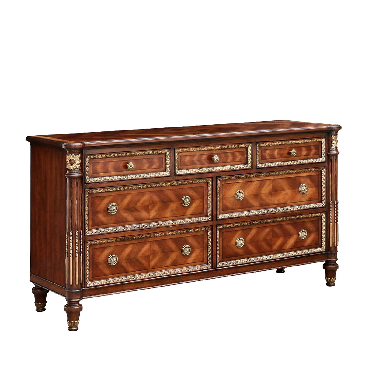 * 為表現法國路易時期的莊嚴和浪漫,以法國凡爾賽宮為設計元素。使用歌頌路易十四時期的太陽花雕刻,顯示其王權穩固地位的錐形腿腳設計,配以鉆石圖案的木皮貼面、古銅色的球形把手和貼金工藝,完美演繹了法式宮廷家具的奢華尊貴。