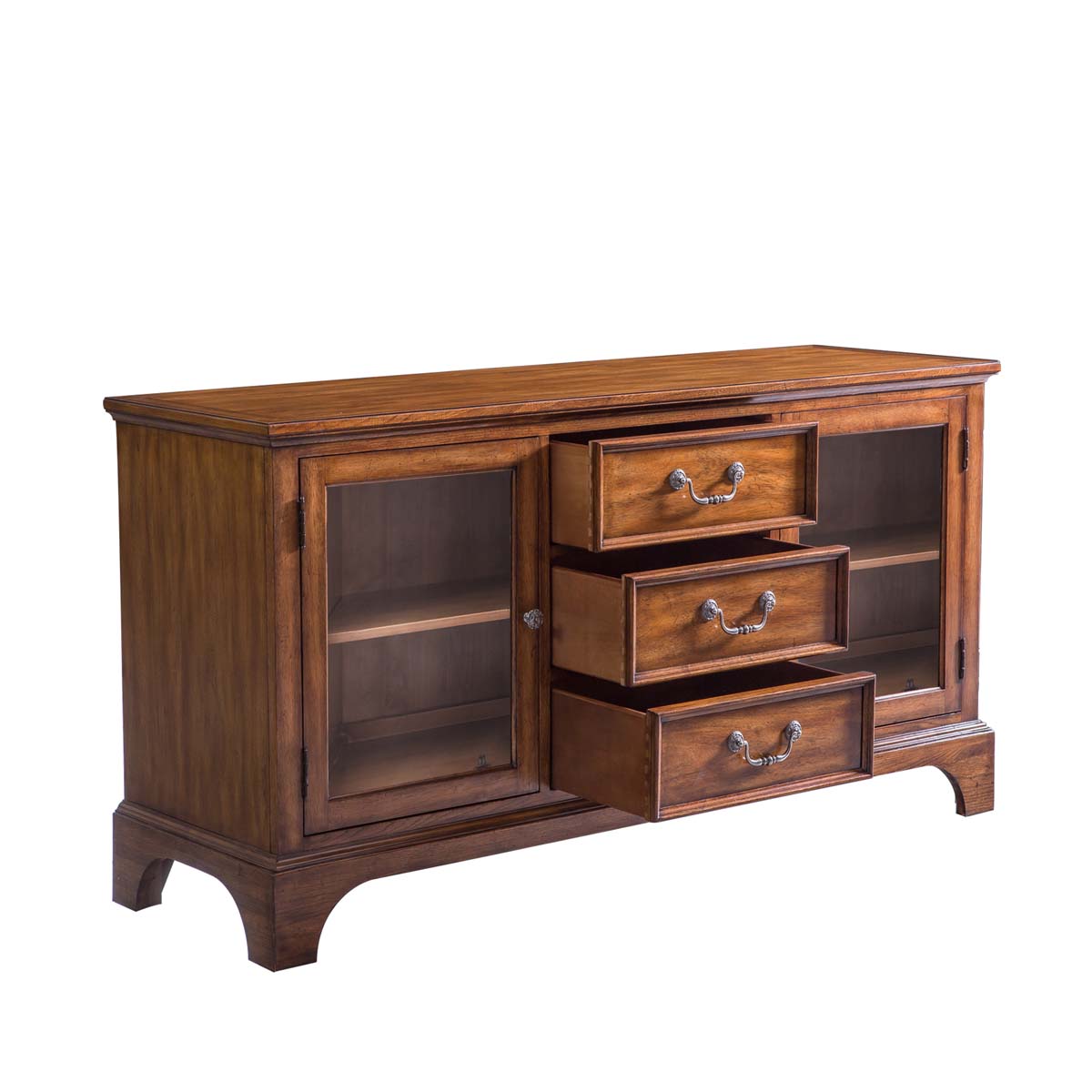 * 3個儲物抽斗,采用硬木實木滑軌設計; * 兩邊實木框玻璃門,門內各帶一塊木制活動層板 * 腳底部裝有可調整的腳釘;