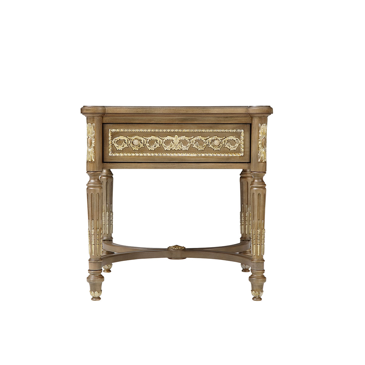 * 為表現(xiàn)法國路易時期的莊嚴(yán)和浪漫,以法國凡爾賽宮為設(shè)計元素。使用歌頌路易十四時期的太陽花連環(huán)雕刻,顯示其王權(quán)穩(wěn)固地位的錐形腿腳設(shè)計;配以哥特式建筑中的大圓窗骨架設(shè)計、建筑柱雕刻與絢麗的貼金工藝,完美演繹了法式宮廷家具的奢華尊貴。