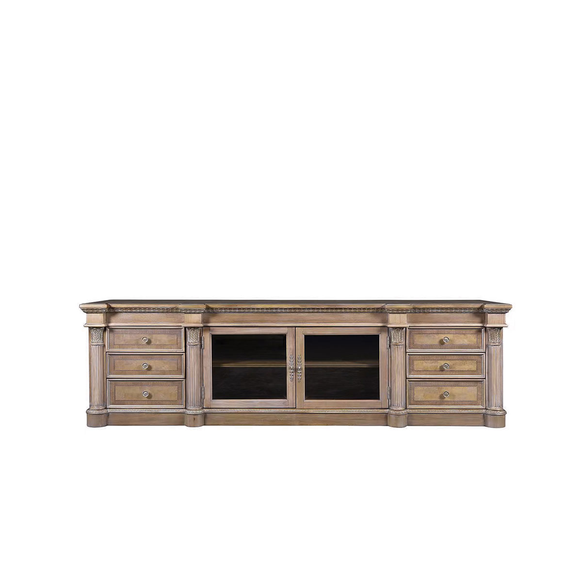 翡冷翠電視柜白栓樹瘤、橡木皮、楓木等多種木皮進(jìn)行手工拼花彰顯了古老手工技藝的迷人魅力,羅馬圓柱飾以細(xì)膩的阿坎賽斯葉狀雕刻與描金工藝,搭配功能性儲(chǔ)存空間,將藝術(shù)審美與實(shí)用功能進(jìn)行了完美的結(jié)合。