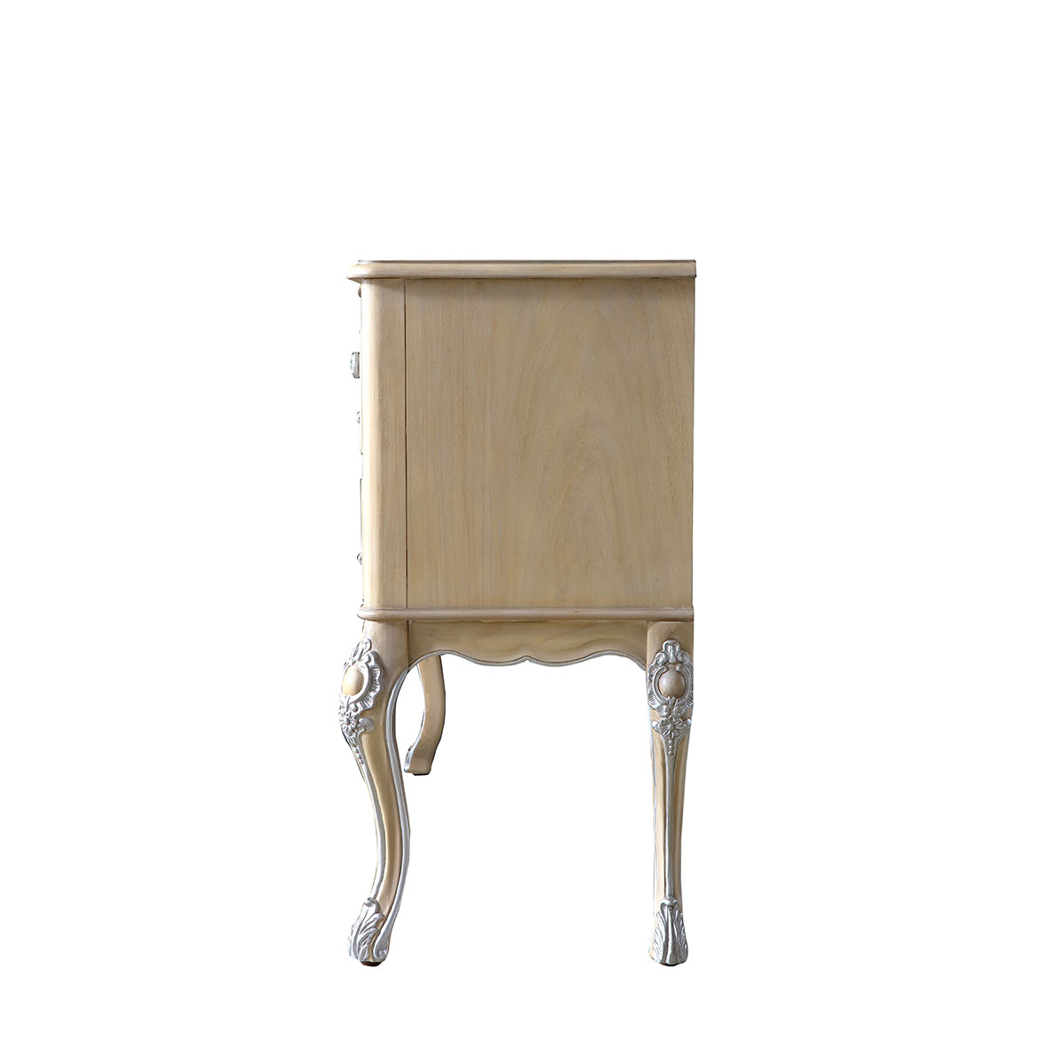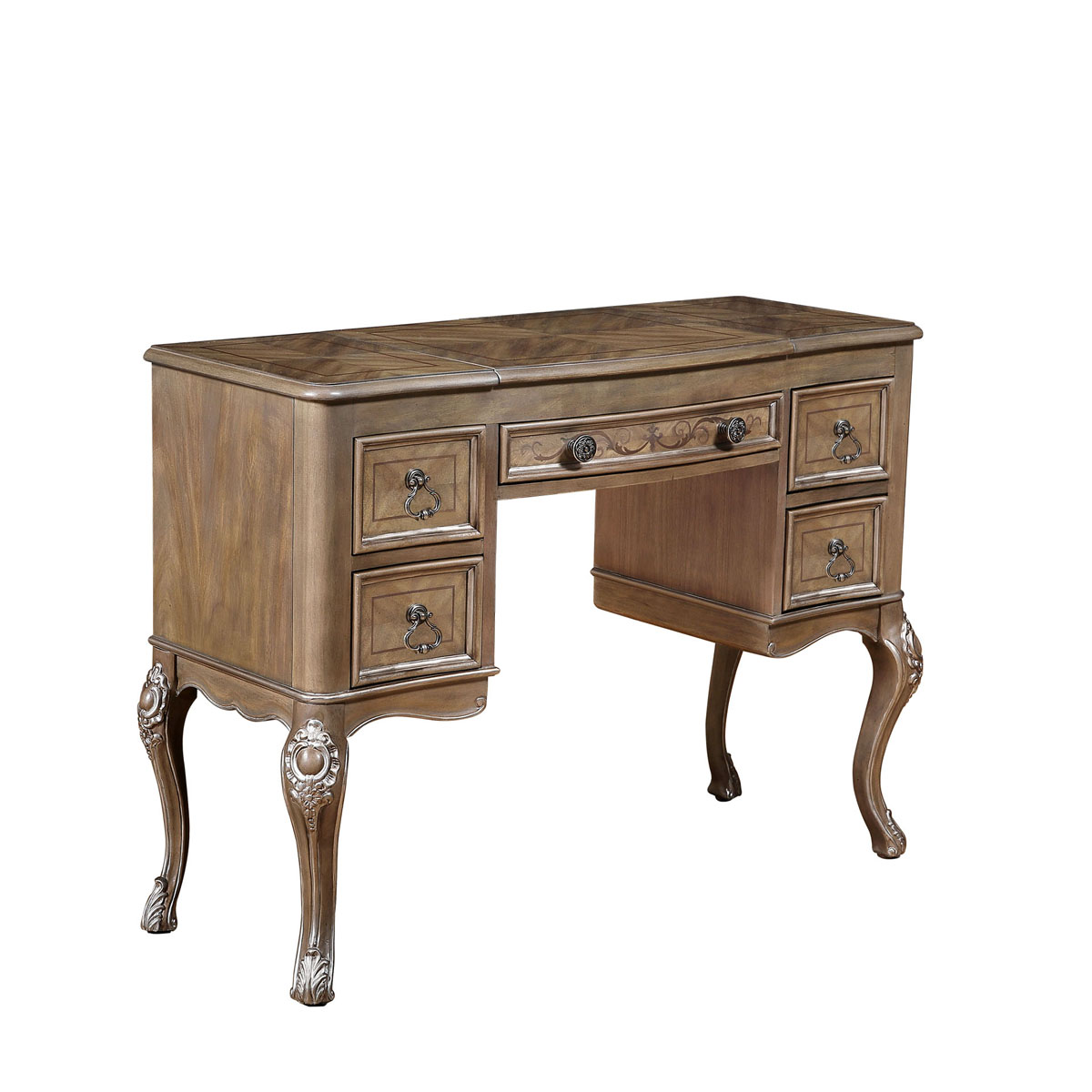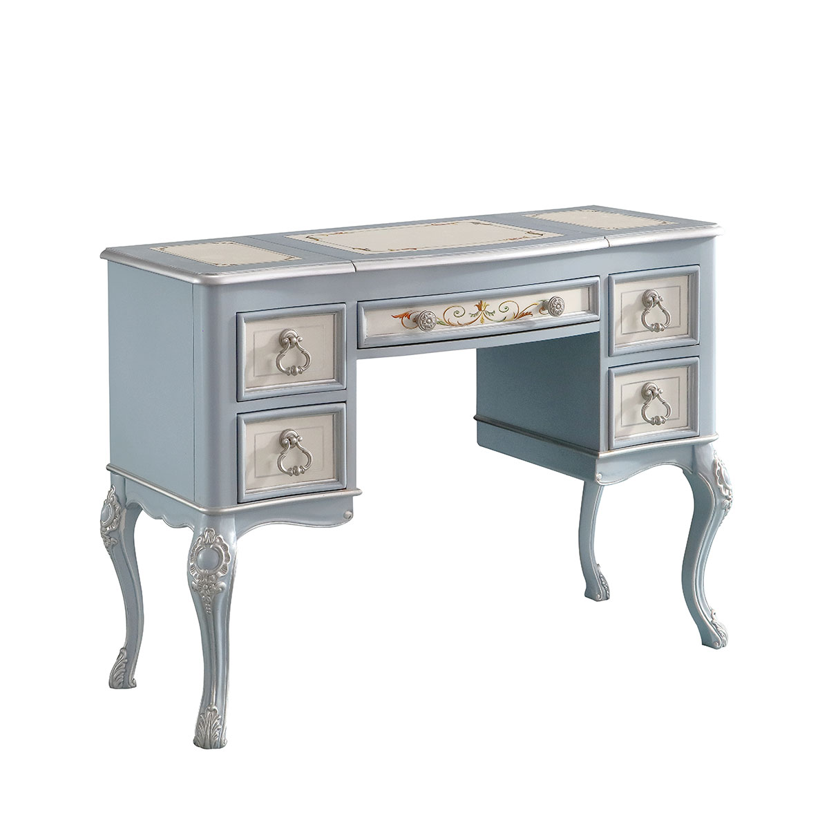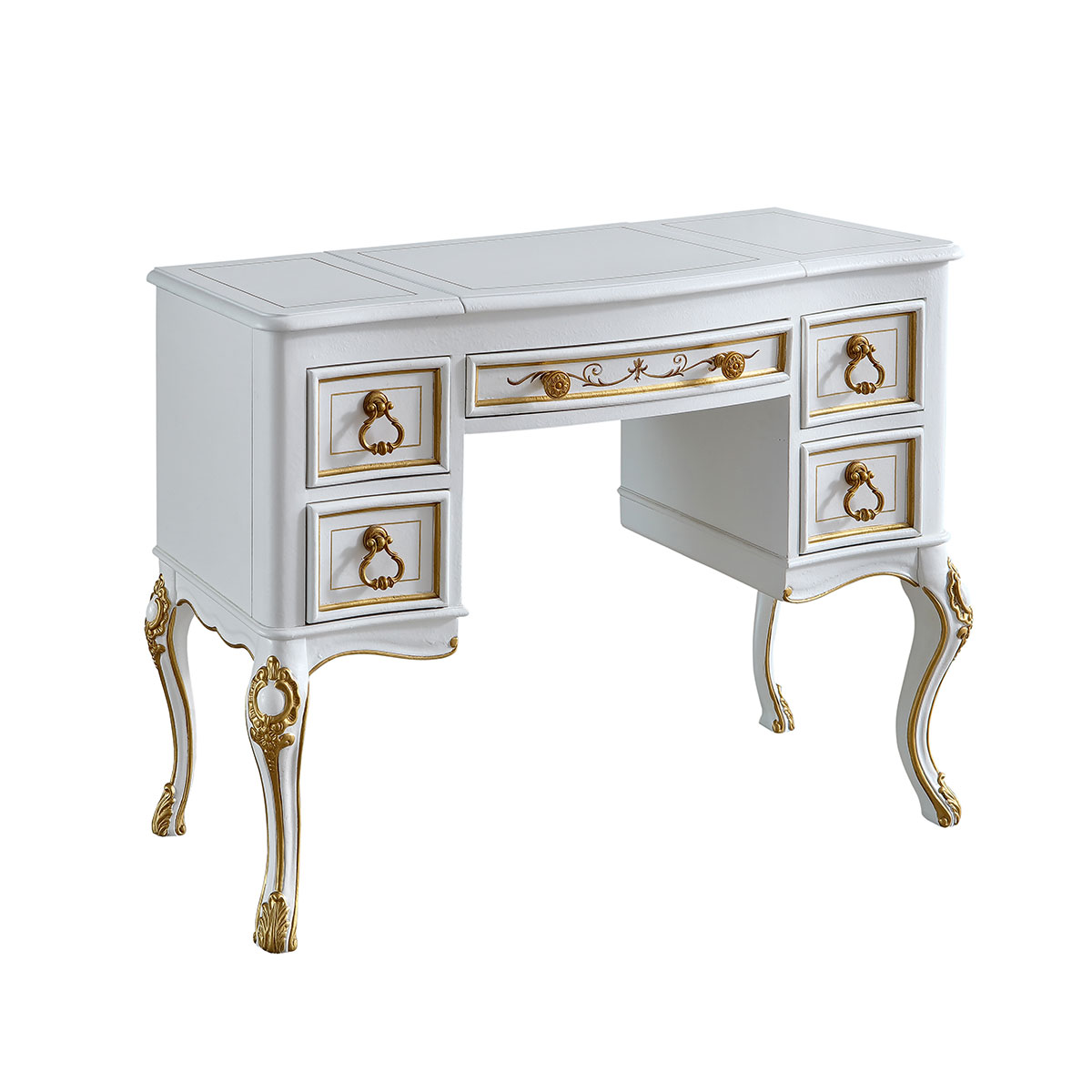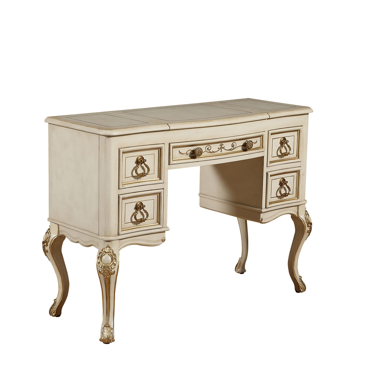 * 四個儲物抽斗,底部采用硬木實木滑軌.中間抽斗的設計可翻下斗面,用來放置鍵盤,抽斗內側有電線孔,抽斗兩邊裝有兩條三節消聲鐵滑軌,滑順耐用; * 中間面板可打開,里面有鏡子和絨布戒指格; * 腳底部裝有可調腳釘