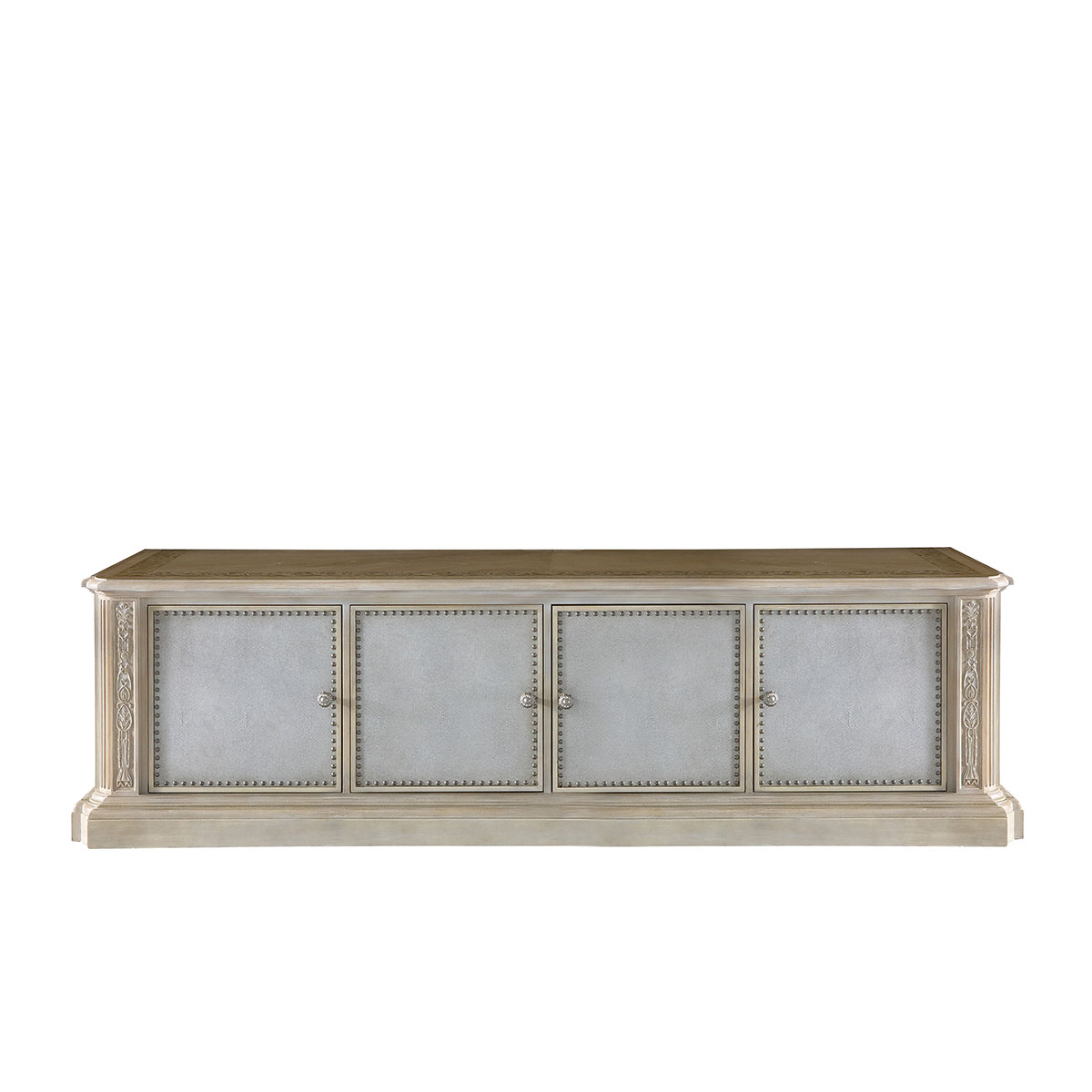 玻璃為畫板,銀箔壓花,在復(fù)古彩繪色調(diào)中傾注人性情感,原本單調(diào)的美便生動(dòng)了起來。栩栩如生的花紋圖案帶來幸福的福音,彰顯頑強(qiáng)的生命力量;沉穩(wěn)端莊的電視柜遵循著對稱的法則。