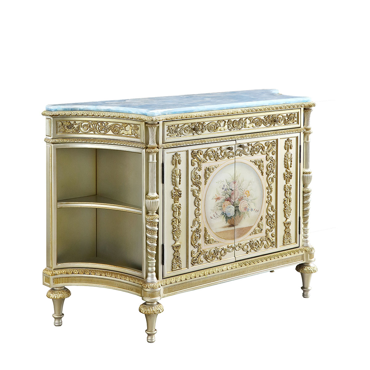 * 這是設計意念來自于英國溫莎堡中安妮女王時期的走廊柜。柜門上的花草彩繪是安妮女王喜歡觀賞園藝的寫照。羅馬短劍裝飾花紋,則表現軍隊的強悍和靈活。配上精致的手工雕刻細節和貼金工藝,是豪華系列溫莎堡英式走廊柜的特色。