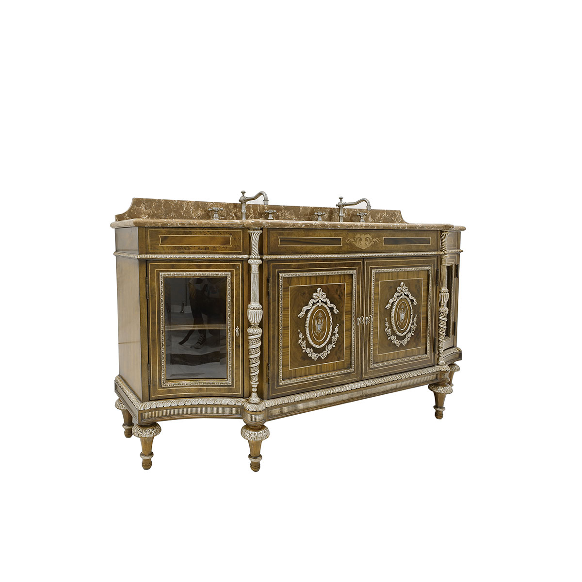 來自中世紀(jì)英國(guó)溫莎城堡的親切問候,獨(dú)特的手工花紋藤蔓雕刻,精致的桃花芯木與黑胡桃木皮貼面帶出材質(zhì)高貴質(zhì)感,光滑的盥洗瓷器與溫潤(rùn)實(shí)木相輔相成,釋放皇權(quán)貴族的生命熱度。