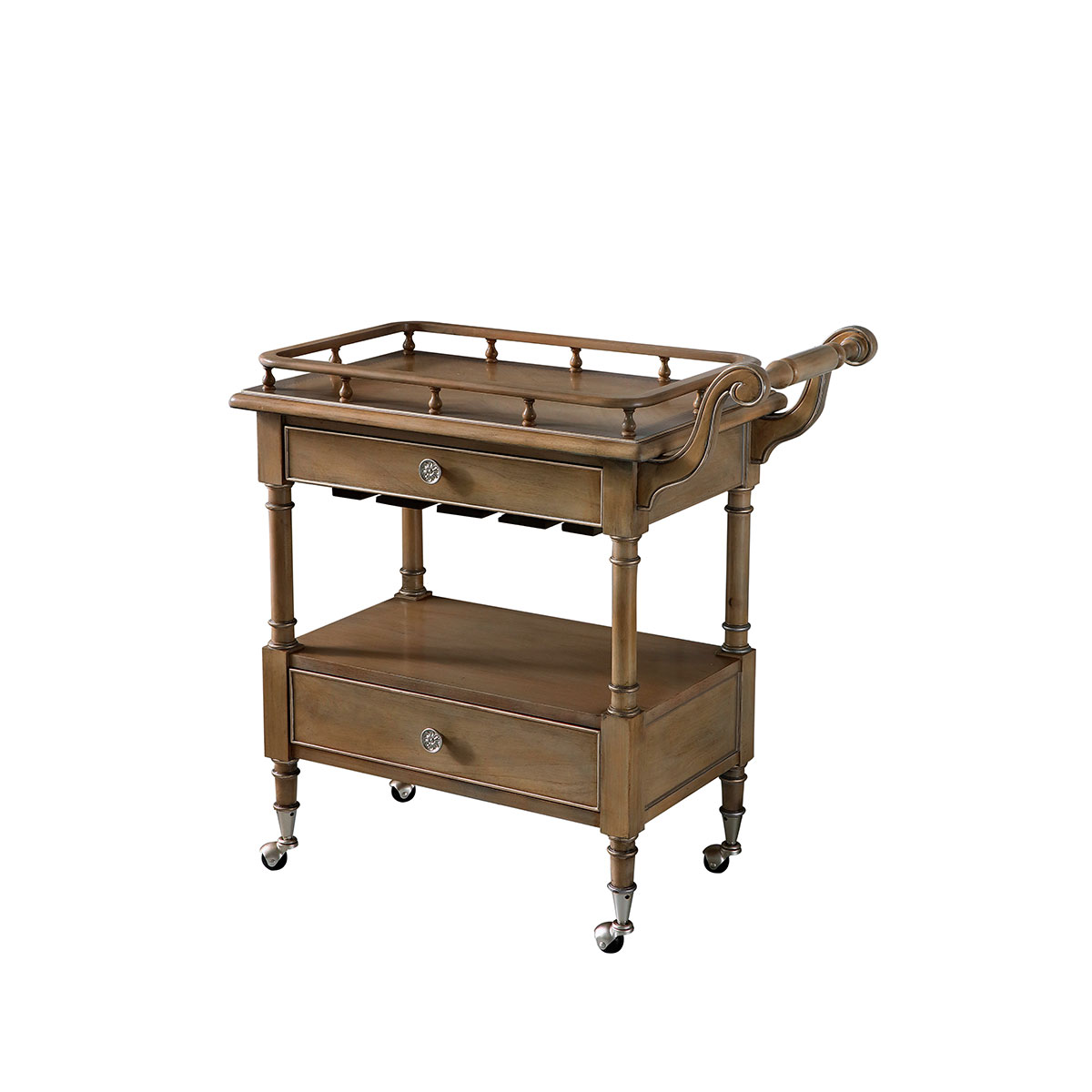 * 二個儲物抽斗,底部采用經典的硬木實木滑軌 * 頂上有護邊帶推手,底下帶腳輪,中間帶掛酒杯的木制瓶架。
