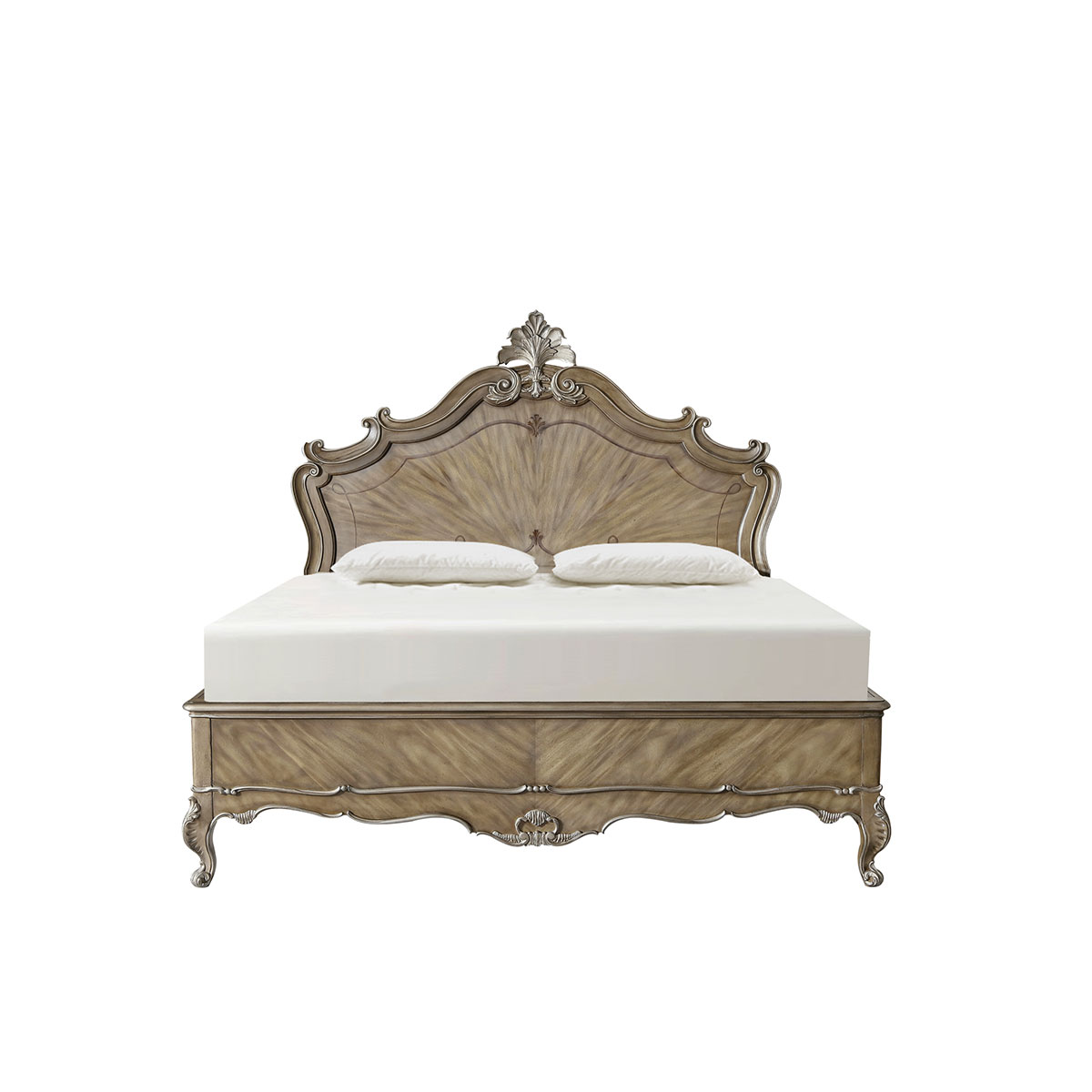 * 維羅納板式床華麗動感的旋渦狀線條勾勒出意大利靈動的藝術之態。閃影艷陽花放射狀的木皮拼花配以帶仿古效果的色澤痕跡,更顯古典奢華與現代美學的結合意大利色彩。床尾鑲嵌如意釦和茛苕葉點綴,寓意如意和祥。