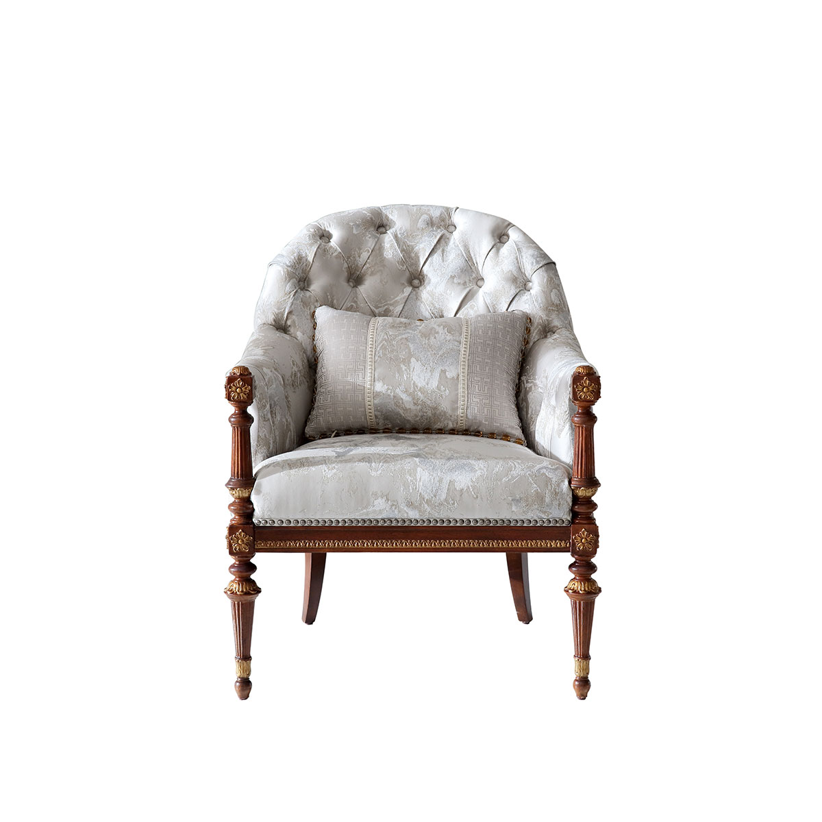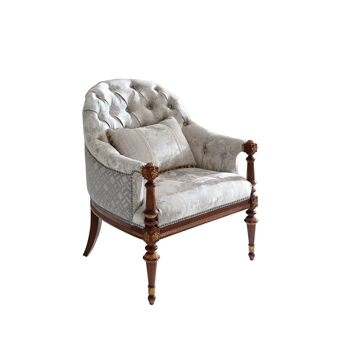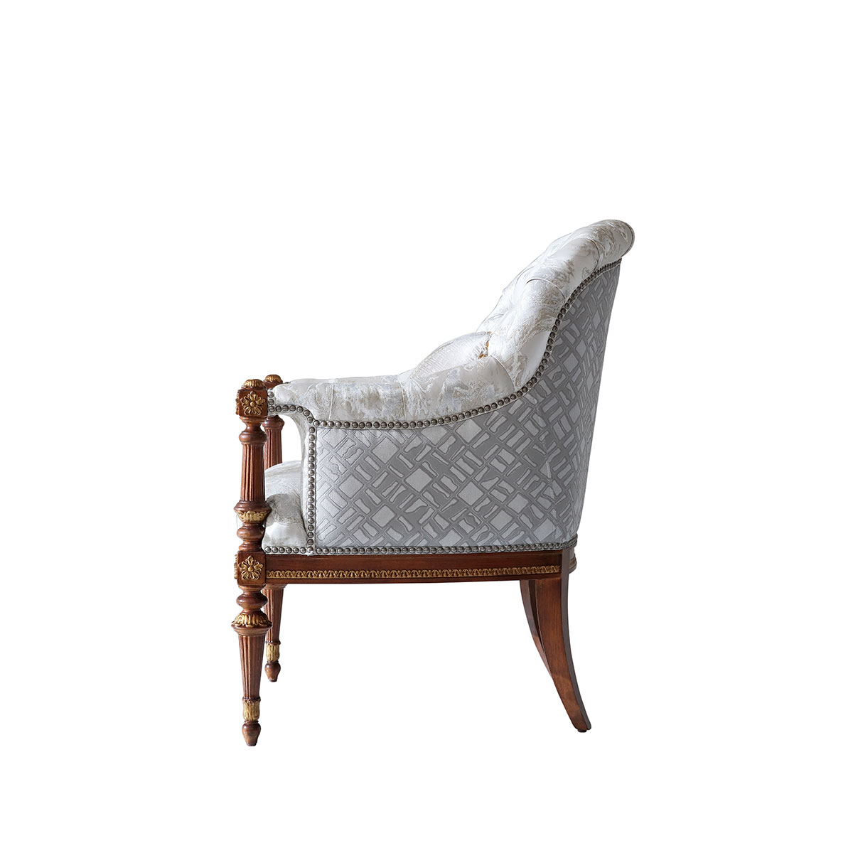 根據意大利古羅馬的建筑為設計理念的休閑椅,羅馬柱化身為椅腳,正方體鑲花扶手如權杖般威儀,帶來意式古典的肅穆;弧形椅背在仿寶石深點拉扣穩固之下又倍顯優雅,彰顯意大利莊嚴而雅致的藝術韻味。