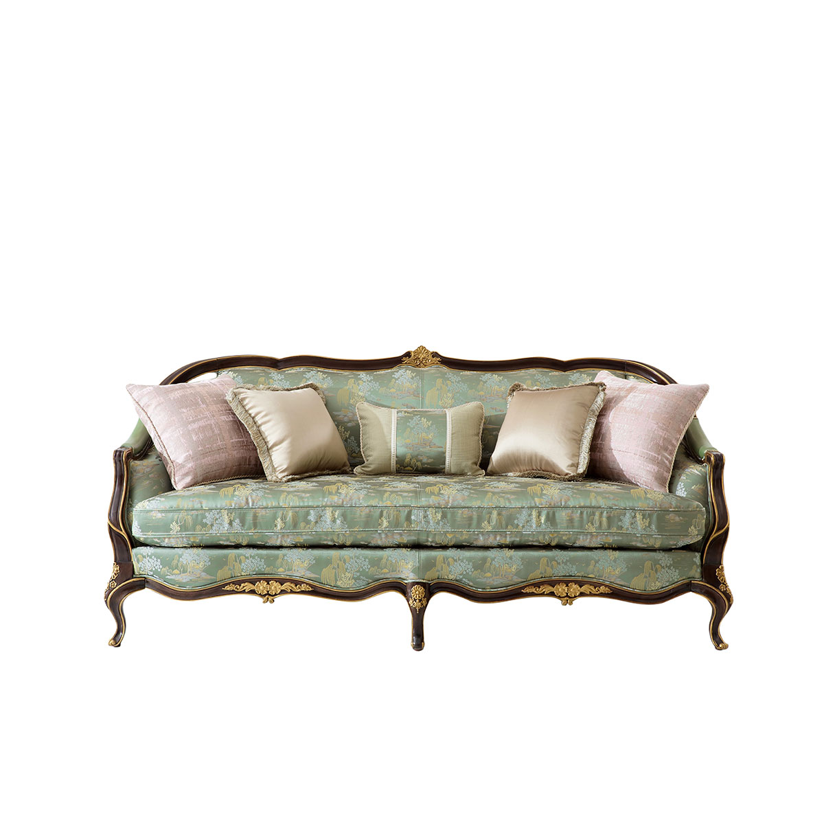 * 沙發(fā)外形布滿手工實(shí)木雕刻的花環(huán)和卷葉圖案 ; * 6只彎形雕刻腳 * 沙發(fā)前方、坐墊及背部包有豐厚的填充物 ; * 扶手設(shè)計(jì)源于法式經(jīng)典翼背椅(Wing Back Chair) ; * 標(biāo)配抱枕:500*500 2個(gè) 430*430 2個(gè) 320*500 1個(gè); * 提供多種面料選擇;