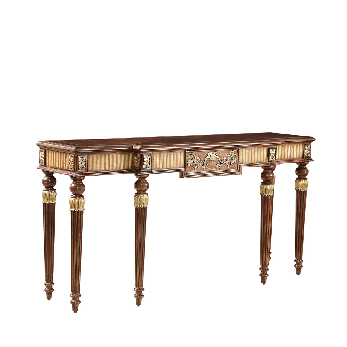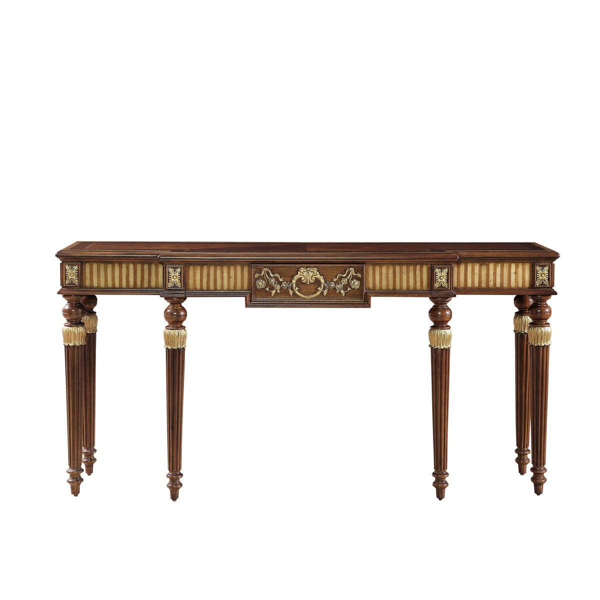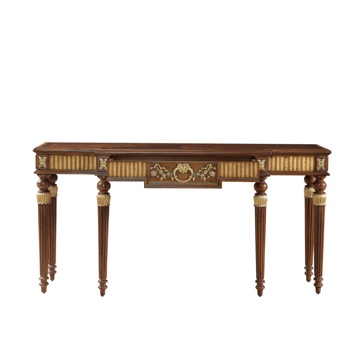 * 為表現(xiàn)英國(guó)皇室的華麗和莊嚴(yán),以英國(guó)溫莎堡為設(shè)計(jì)元素。使用新古典風(fēng)格的錐形腿腳設(shè)計(jì),以顯示王權(quán)的穩(wěn)固地位,配上二龍戲珠的手工雕刻細(xì)節(jié)和貼金箔工藝,是豪華系列溫莎堡英式沙發(fā)桌的特色。