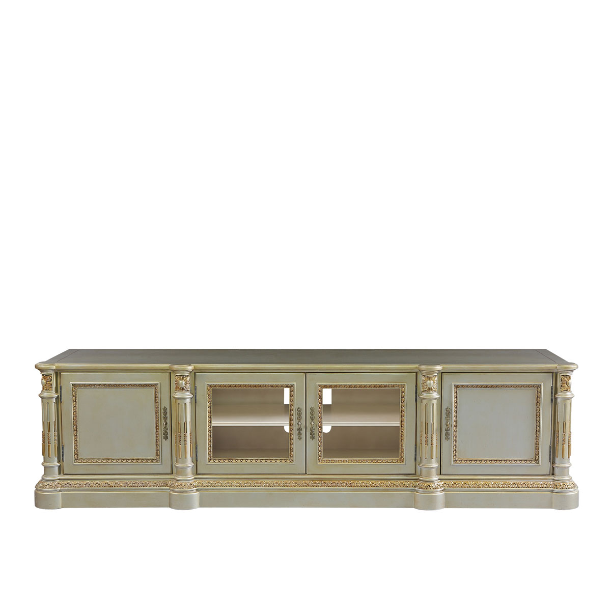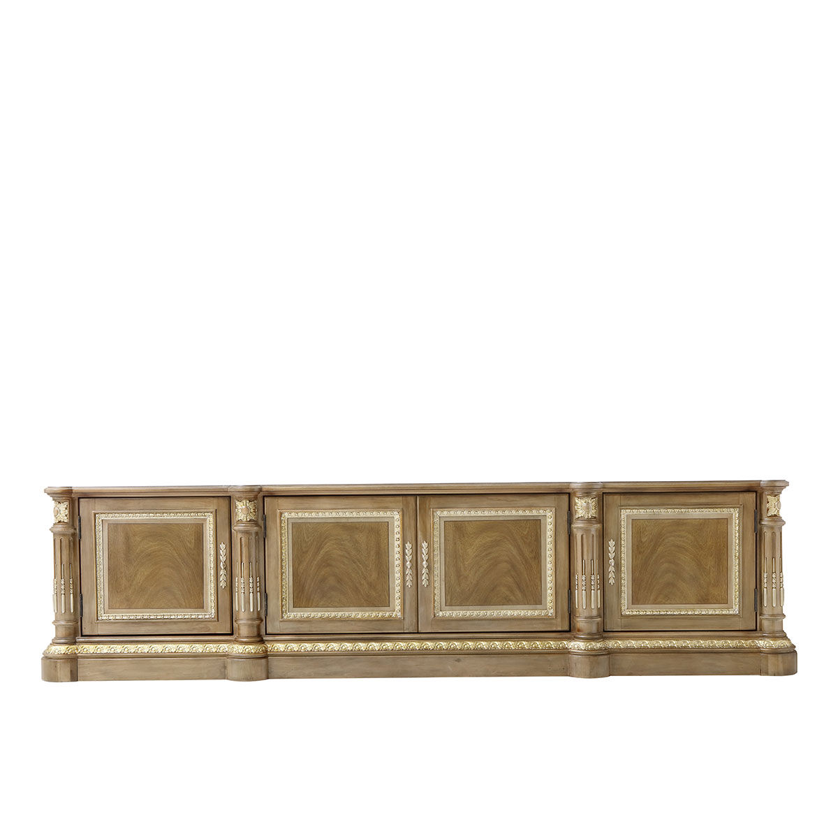 *為表現(xiàn)法國(guó)路易時(shí)期的莊嚴(yán)和浪漫,以法國(guó)凡爾賽宮為設(shè)計(jì)元素。使用歌頌路易十四時(shí)期的太陽(yáng)花雕刻,優(yōu)雅的黑金色手繪山水畫(huà)與鉆石圖案實(shí)木薄片拼貼工藝,完美演繹了法式宮廷家具的奢華尊貴。