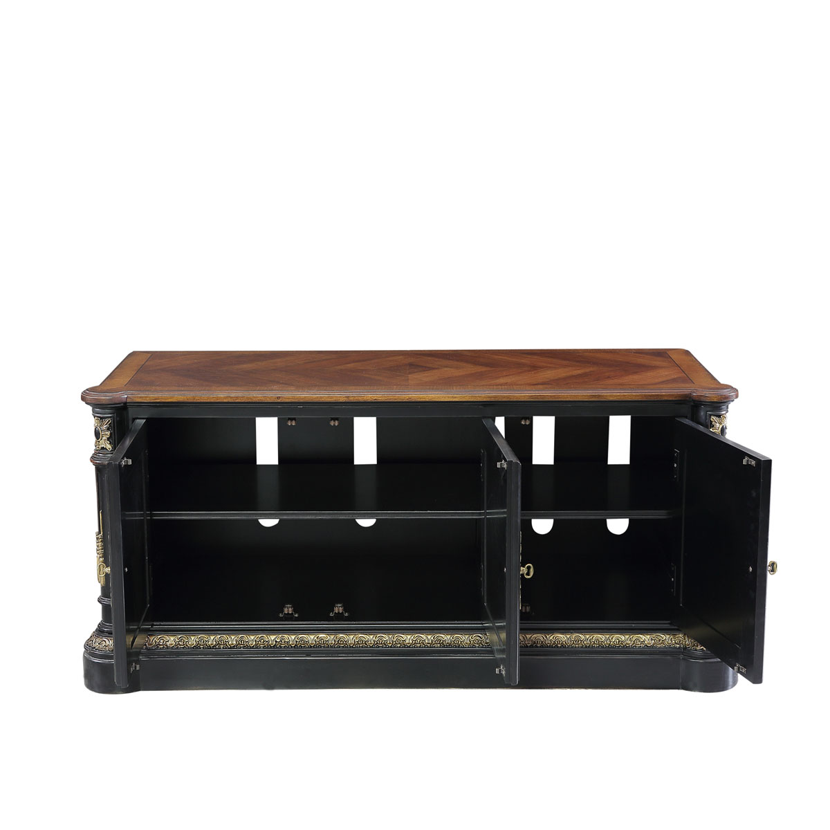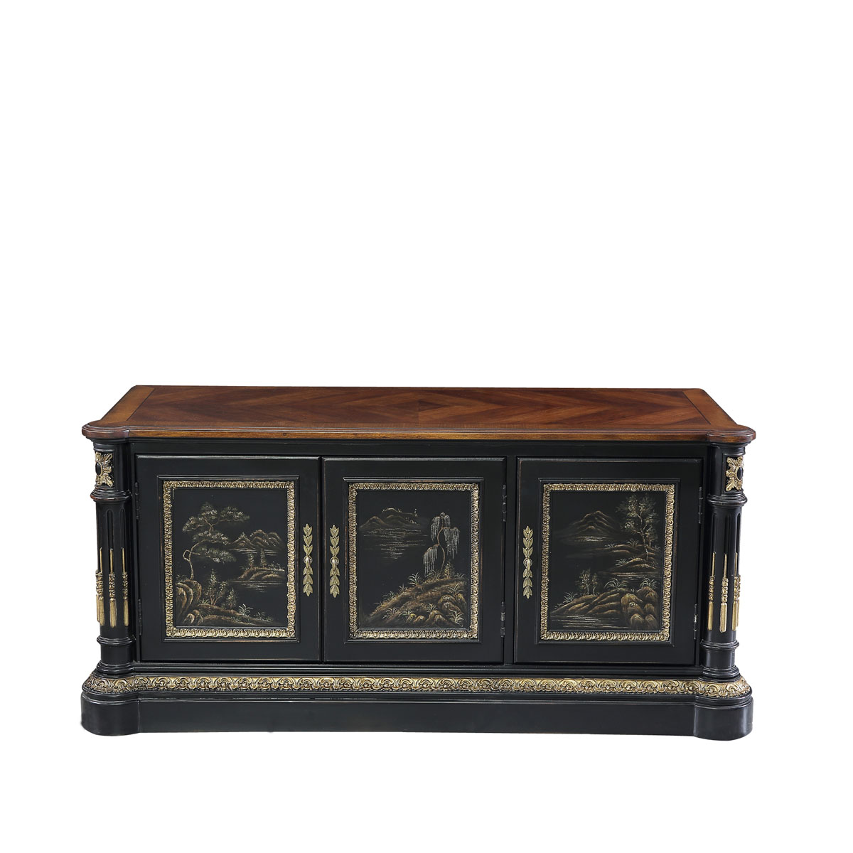 * 為表現法國路易時期的莊嚴和浪漫,以法國凡爾賽宮為設計元素。使用歌頌路易十四時期的太陽花雕刻,優雅的黑金色手繪山水畫與鉆石圖案實木薄片拼貼工藝,完美演繹了法式宮廷家具的奢華尊貴。