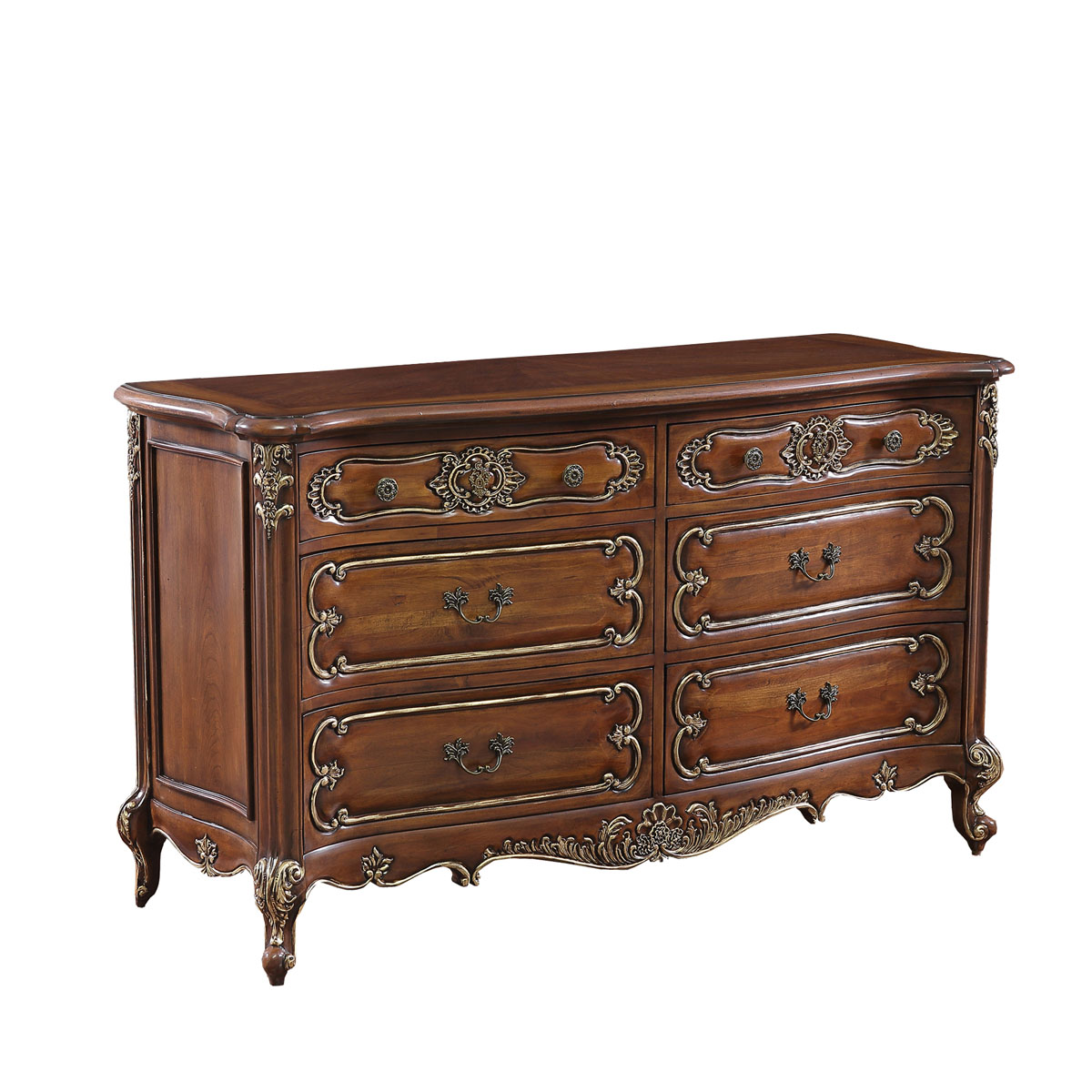 * 手工雕刻的花圃、藤蔓、阿坎瑟斯卷葉圖案和彎腳設計; * 結實的連接技術; * 6個儲物抽斗,右上斗為翻斗,內可置放電子器材,其底部采用經典硬木實木滑軌設計; * 腳底部裝有可調腳釘;