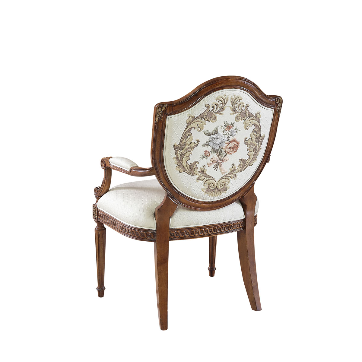法國新古典和洛可可風格,盾型椅背造型簡約大方,建筑柱雕刻柱腿簡約的直線條造型,端莊大氣,采用印花布藝,非常有田園風的感覺。