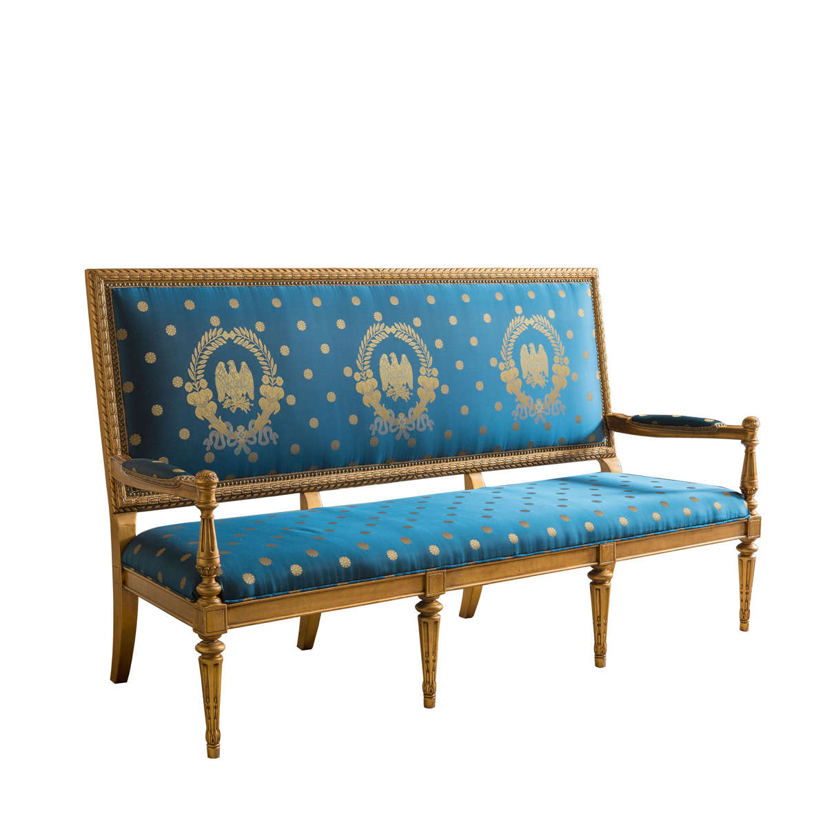 * 這是以美國白宮的Blue Room(藍色房間) 為意念并結合法國元素而設計的沙發。包括建筑雕刻錐形腳、 權杖狀的扶手柱、葉形雕刻外框和貼金鉑工藝,配上代表自由的藍色布藝和包有豐厚的填充物坐墊和靠背。