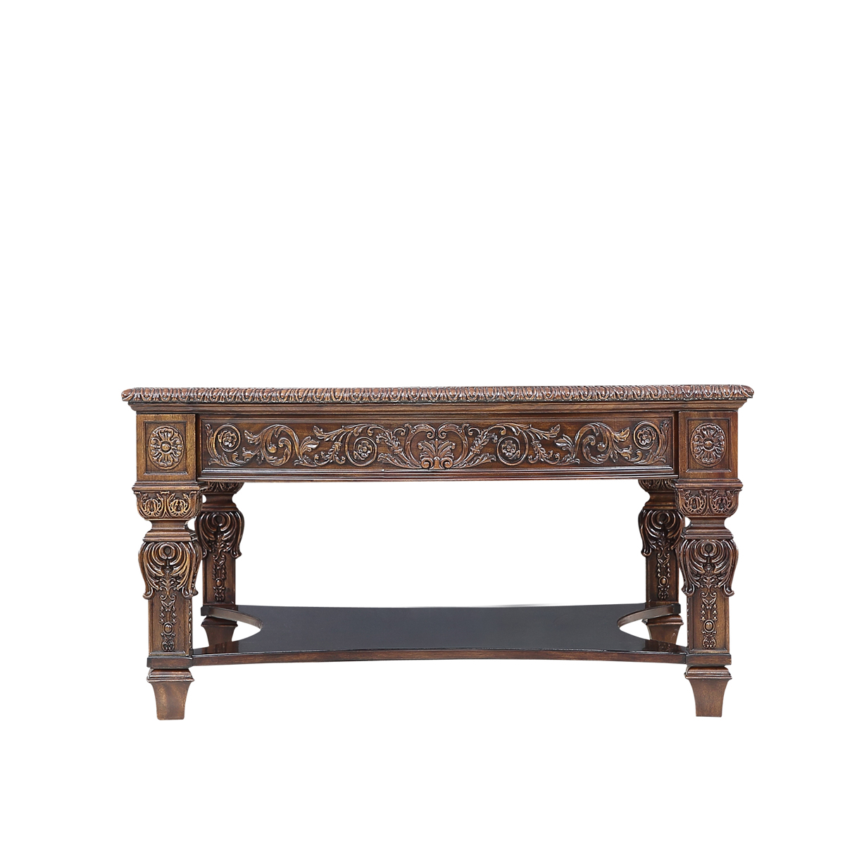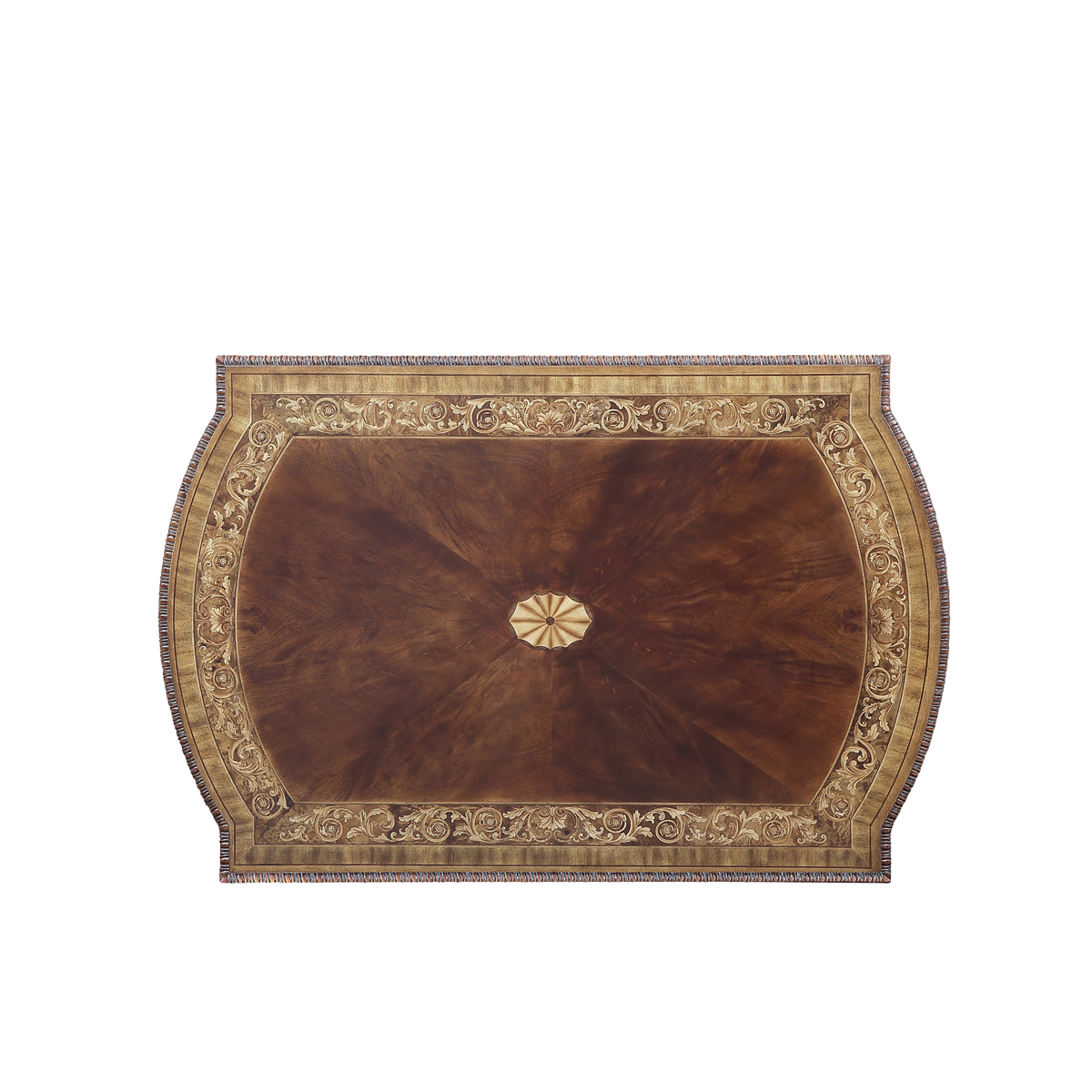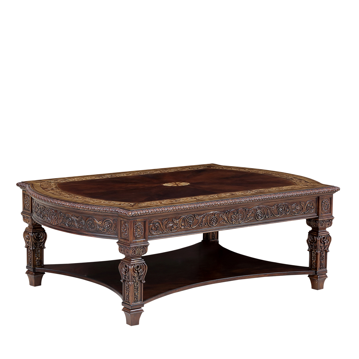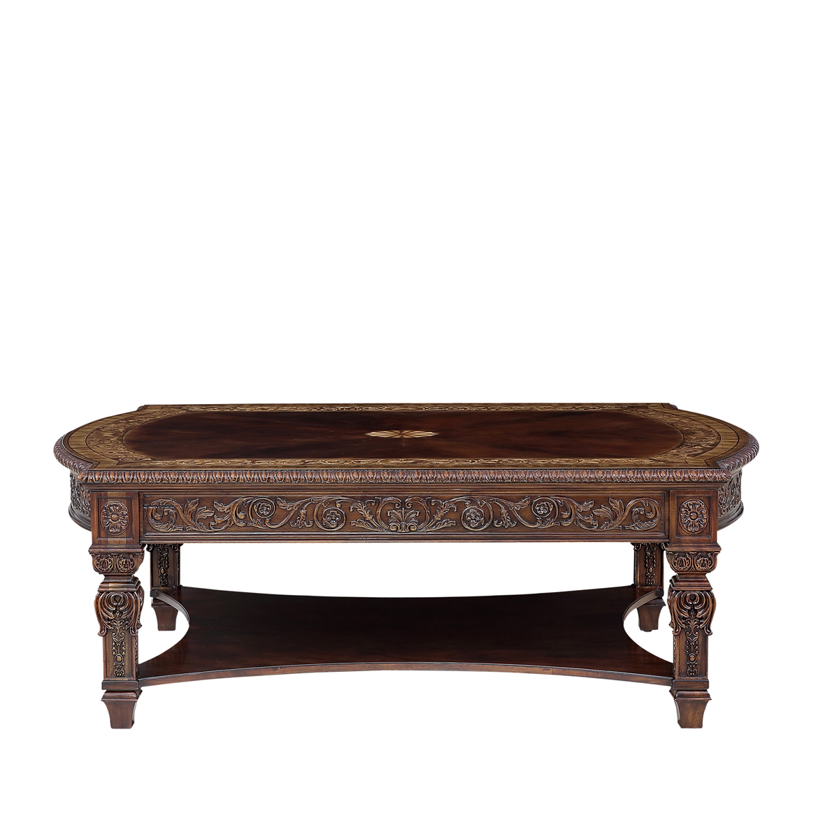 * 以現(xiàn)位于美國白宮中象征友誼和權力的堅毅桌(英語:Resolute desk)為設計意念, 以實木拼貼和雕刻工藝,將具有紀念意義的歷史時刻融入其中,實用性的功能設計更是把藝術和生活完美結合, 是宮廷系列華盛頓美式咖啡臺的特色。(注:咖啡桌前方有兩個儲物抽斗)