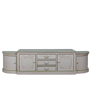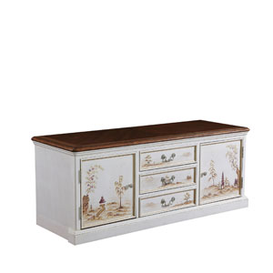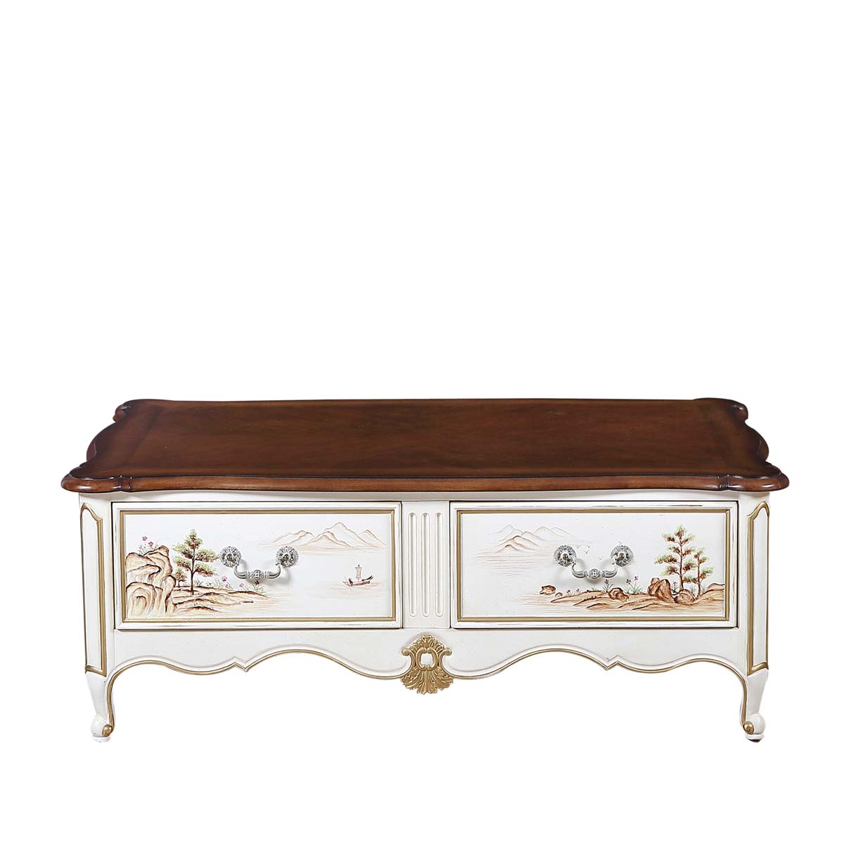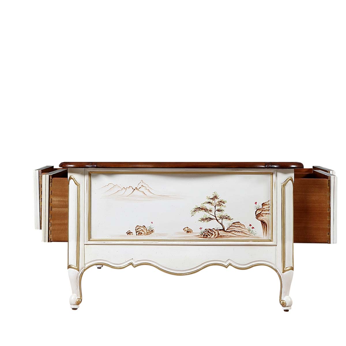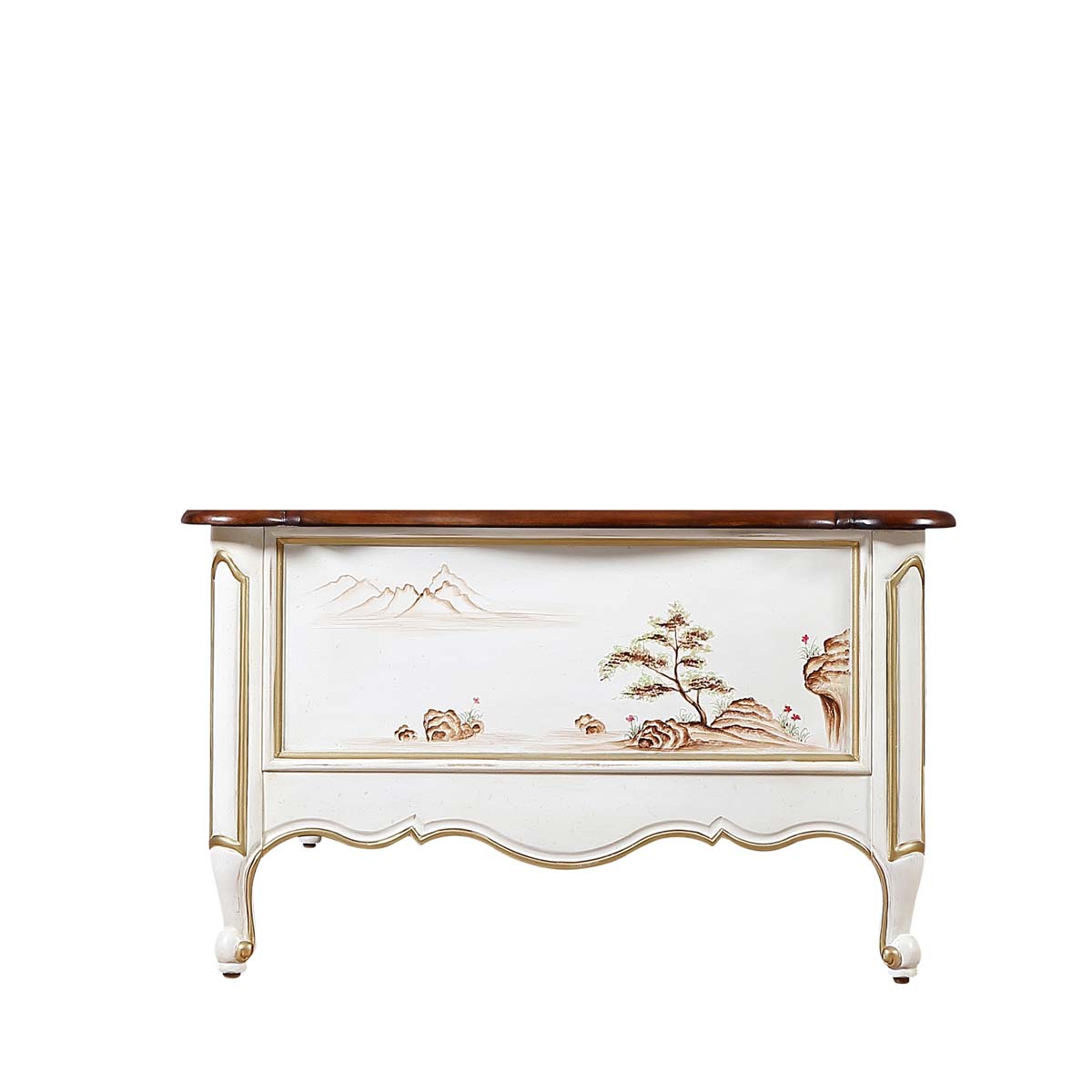 在法式仿古白漆上,手繪上意境深遠的中國風山水畫輕色手繪,古銅色與白色形成強烈的對比,法式新古典家具的結構放置在水平線和垂直線的的處理上曲直結合,活力呈現法式生活美。