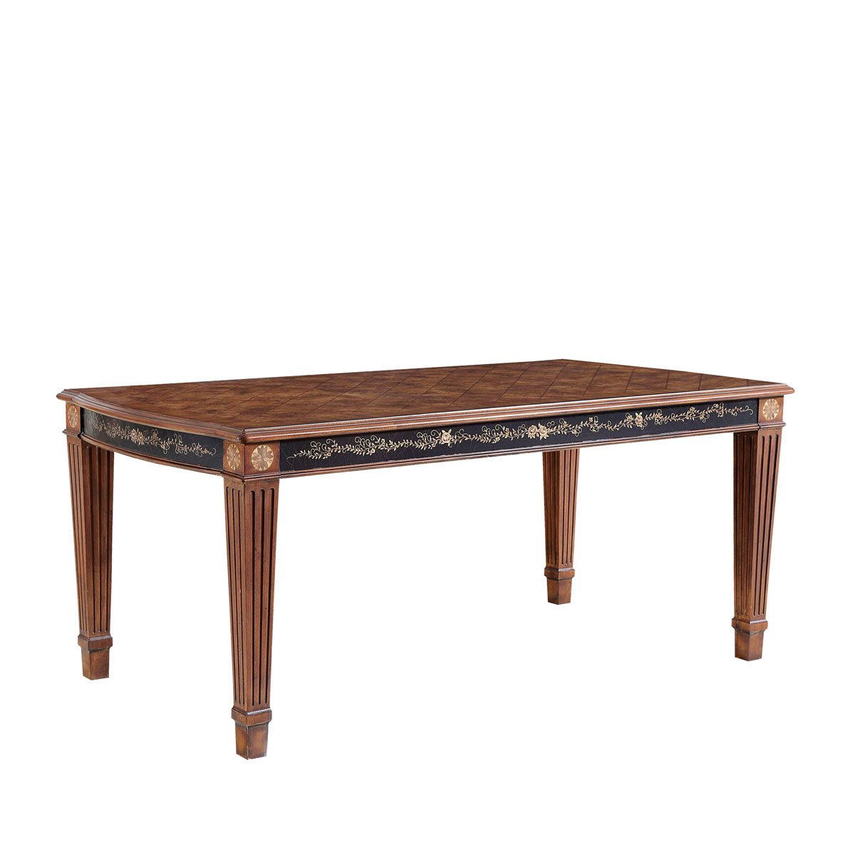 * 采用了喬治王朝后期流行的上粗下細(xì)帶槽紋方形腿,結(jié)合略帶弧度的線條與雅致的木皮貼面,將英式家具在新古典時(shí)期的芳容身姿展露無遺。