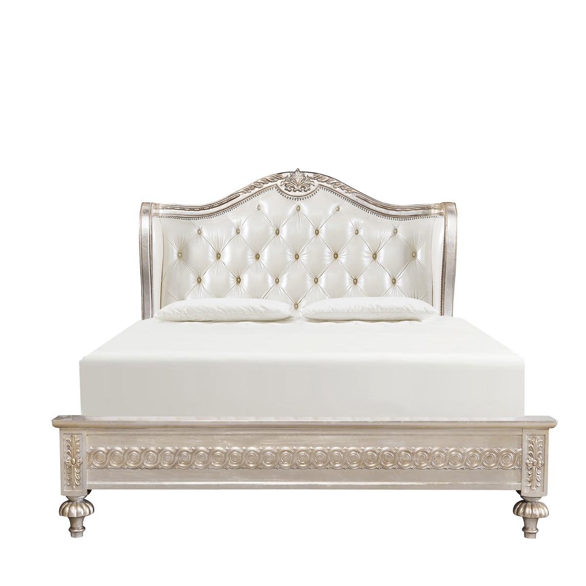 * 延伸的床架布滿手工實木雕刻的花環(huán),卷葉和網眼圖案 * 4只花形雕刻腳 * 中間使用優(yōu)質夾板鋪平,延長床墊的使用年限; * 床頭板包有豐厚的填充物 * 床頭板可提供多種面料可供選擇;