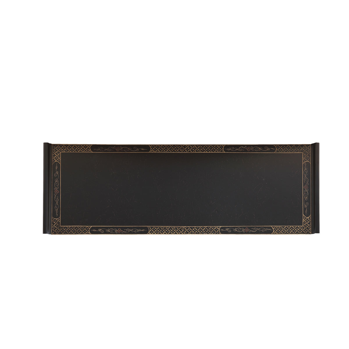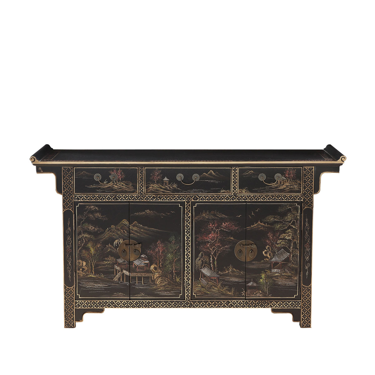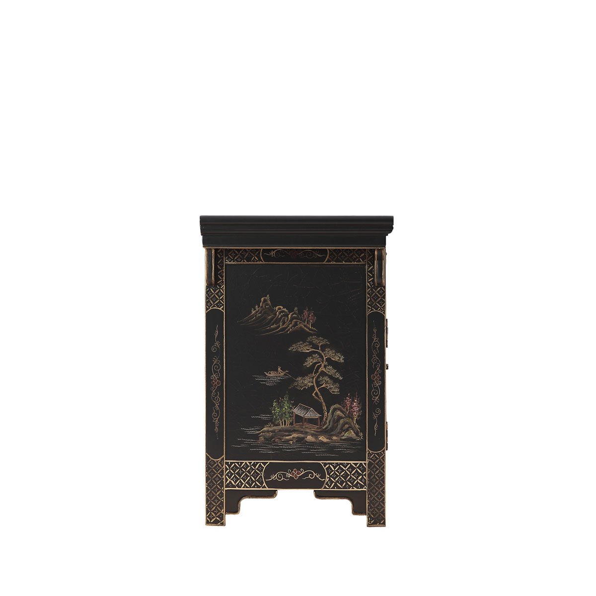 黑底描金的裝飾柜上描以寫意的山水圖畫,婉然掛著一幅大師名作。配上中式建筑的方正造型與菱格錯(cuò)落的描金圖形裝飾,在黑色深沉中增添明亮的點(diǎn)睛之筆,中西文化交融。