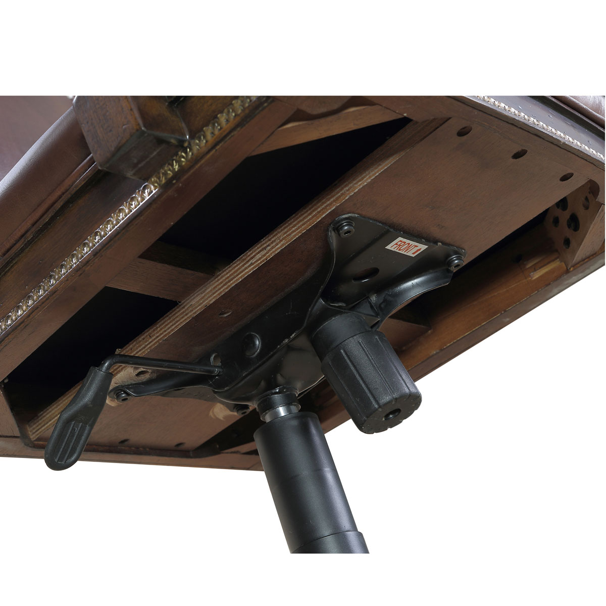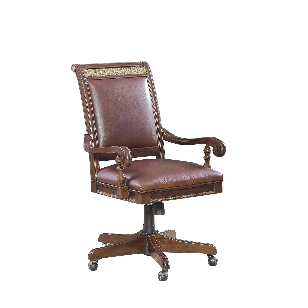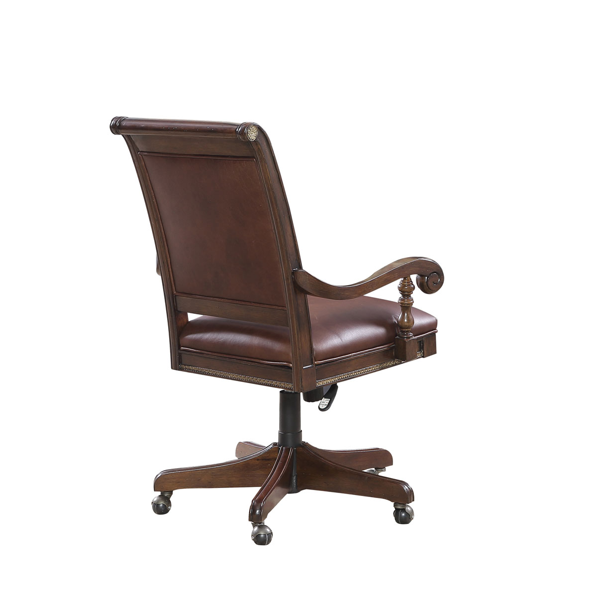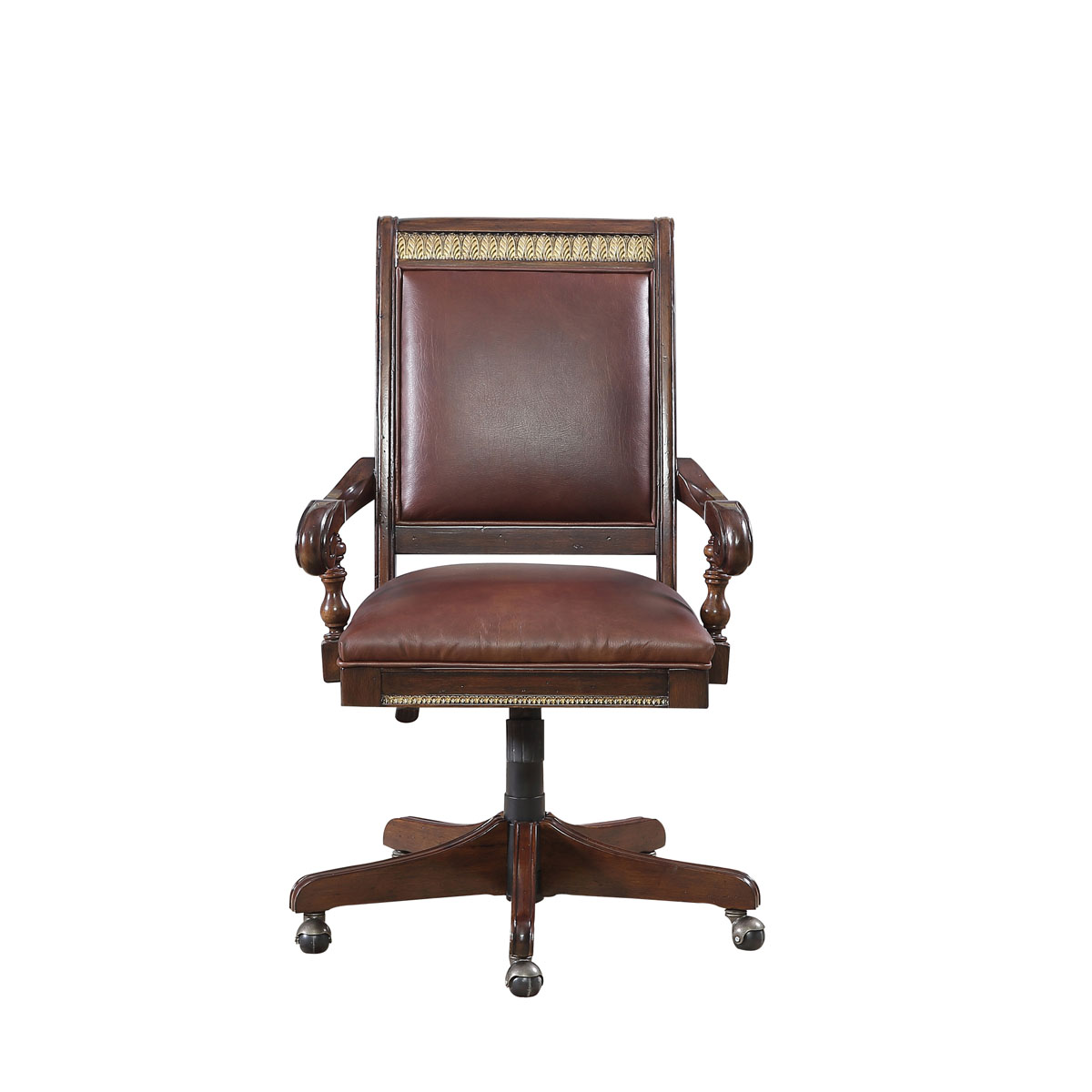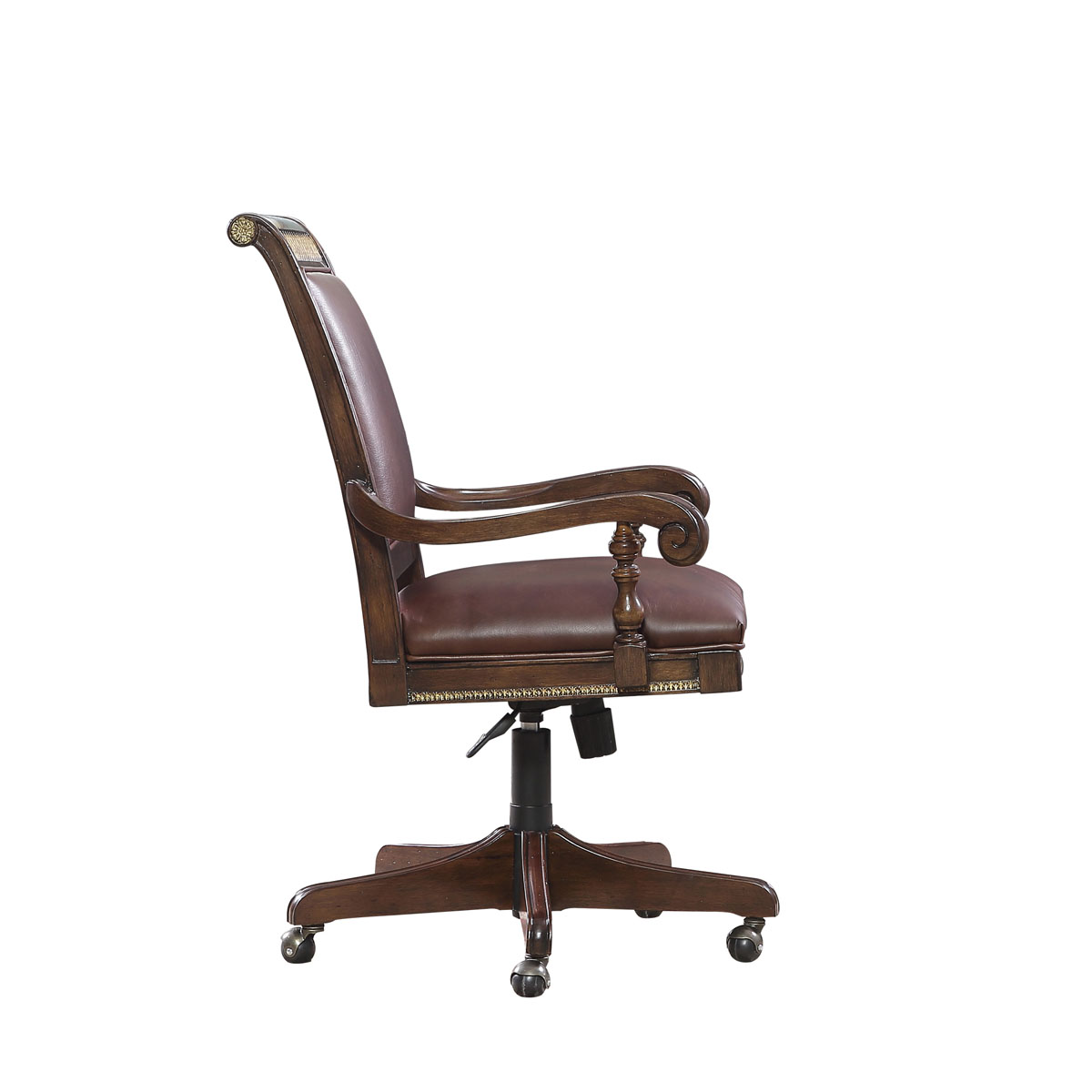 翡冷翠辦公椅細膩的葡萄葉雕刻飾以描金工藝,是從意大利傳承千年的葡萄酒文化中汲取的設計靈感;旋渦狀的羊角扶手結合可調節高度的皮藝坐墊和360度旋轉順暢的腳輪,無疑為良好的辦公環境加持。
