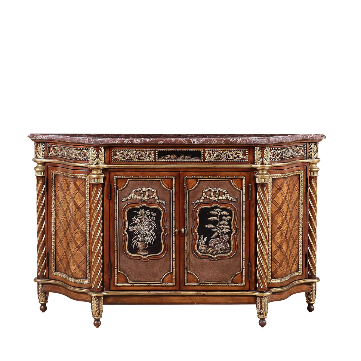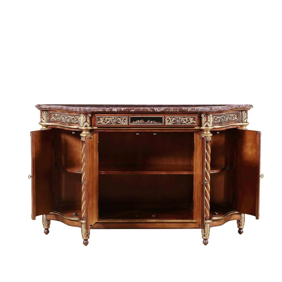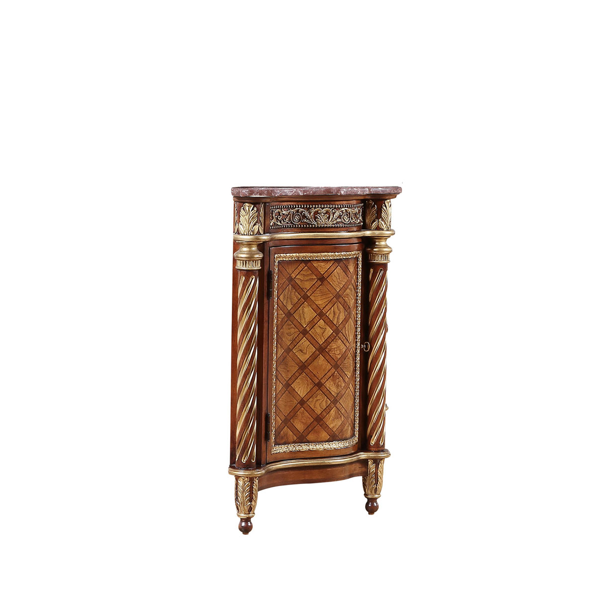 * 手工雕刻的工藝細節,結實的連接技術; * 光滑的花崗巖石表面; * 一個儲物抽斗,其底部采用經典硬木實木滑軌設計; * 門內各有一塊可調層板; * 底部裝有可調腳釘;