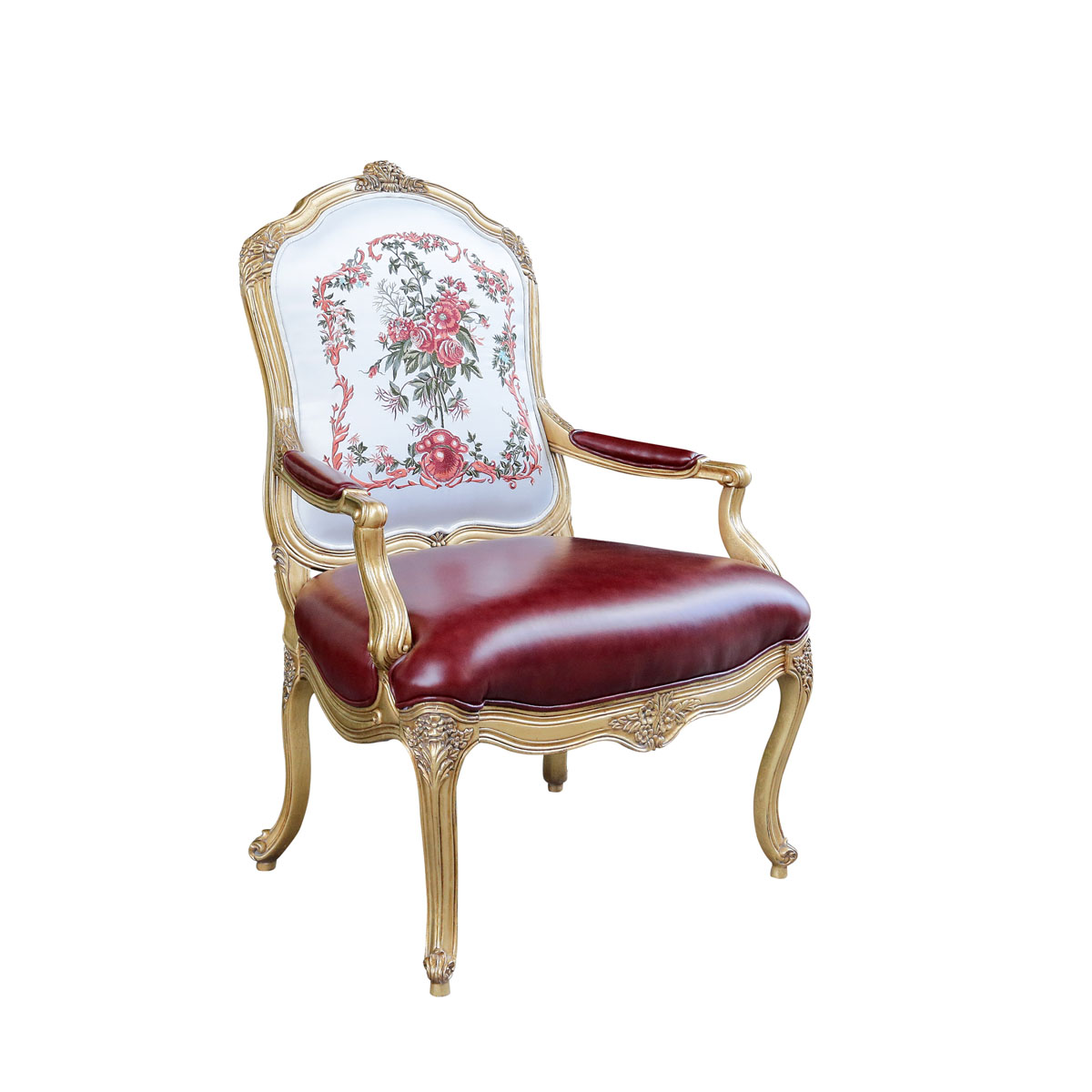 * 以 Louis VX (路易十五)時期洛可可式涂金古董扶手椅為設計靈感,華麗的曲線輪廓配以細膩的雕刻,呈現出法國宮廷的浪漫。不對稱設計的花型布藝設計,更是把洛可可風格的美表達得淋漓盡致。
