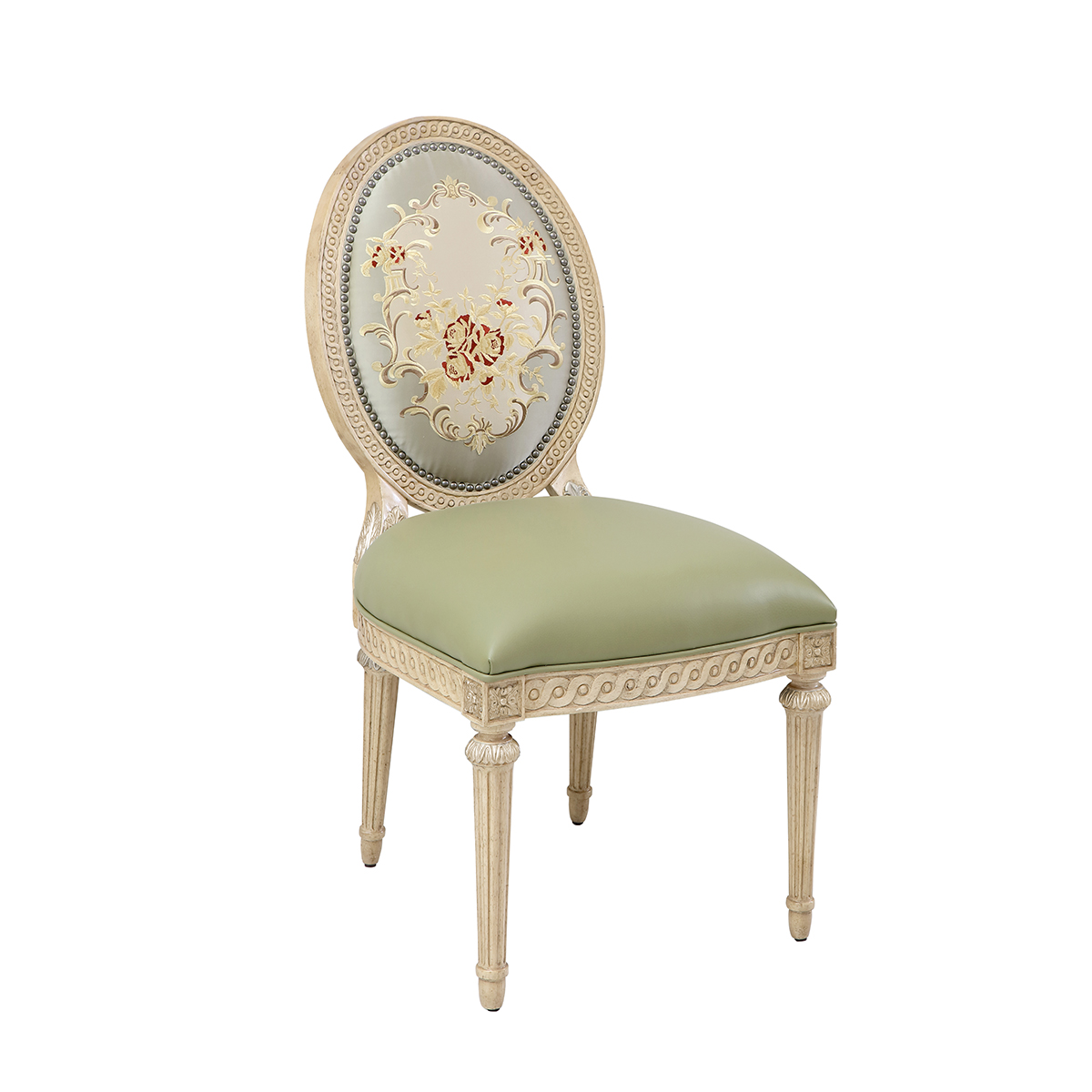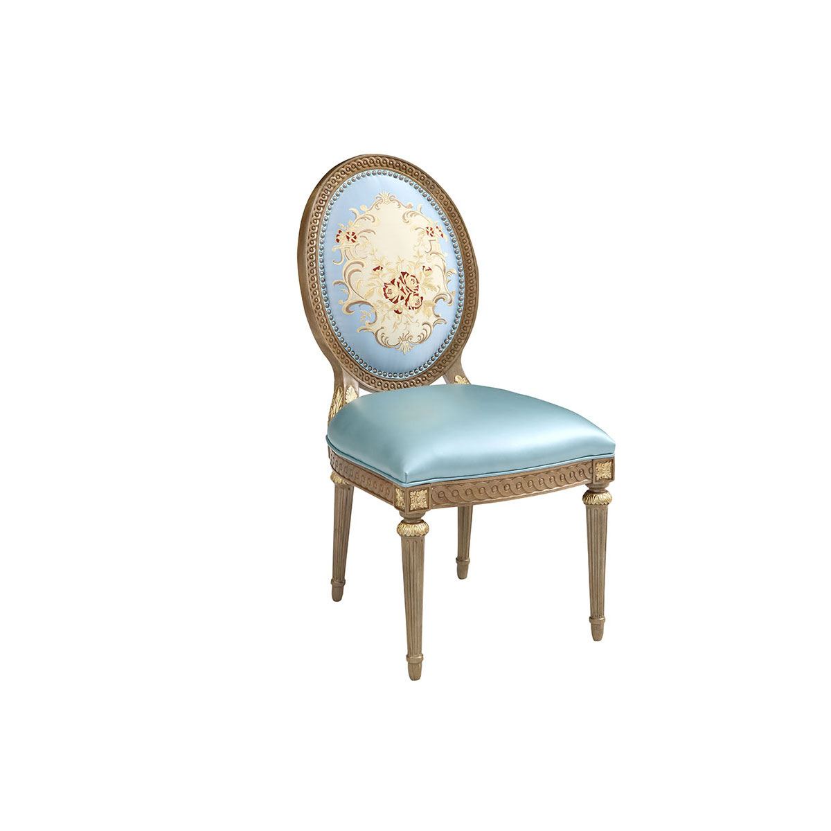 * 參考18世紀法國路易十六時期涂金扶手椅古董設計,并結合同時期的圓面背板設計。配上精致的連續雕刻和貼金鉑工藝、錐形腳設計、觸感舒適的布藝和包有豐厚的填充物坐墊和靠背。