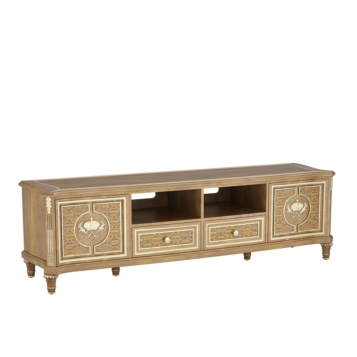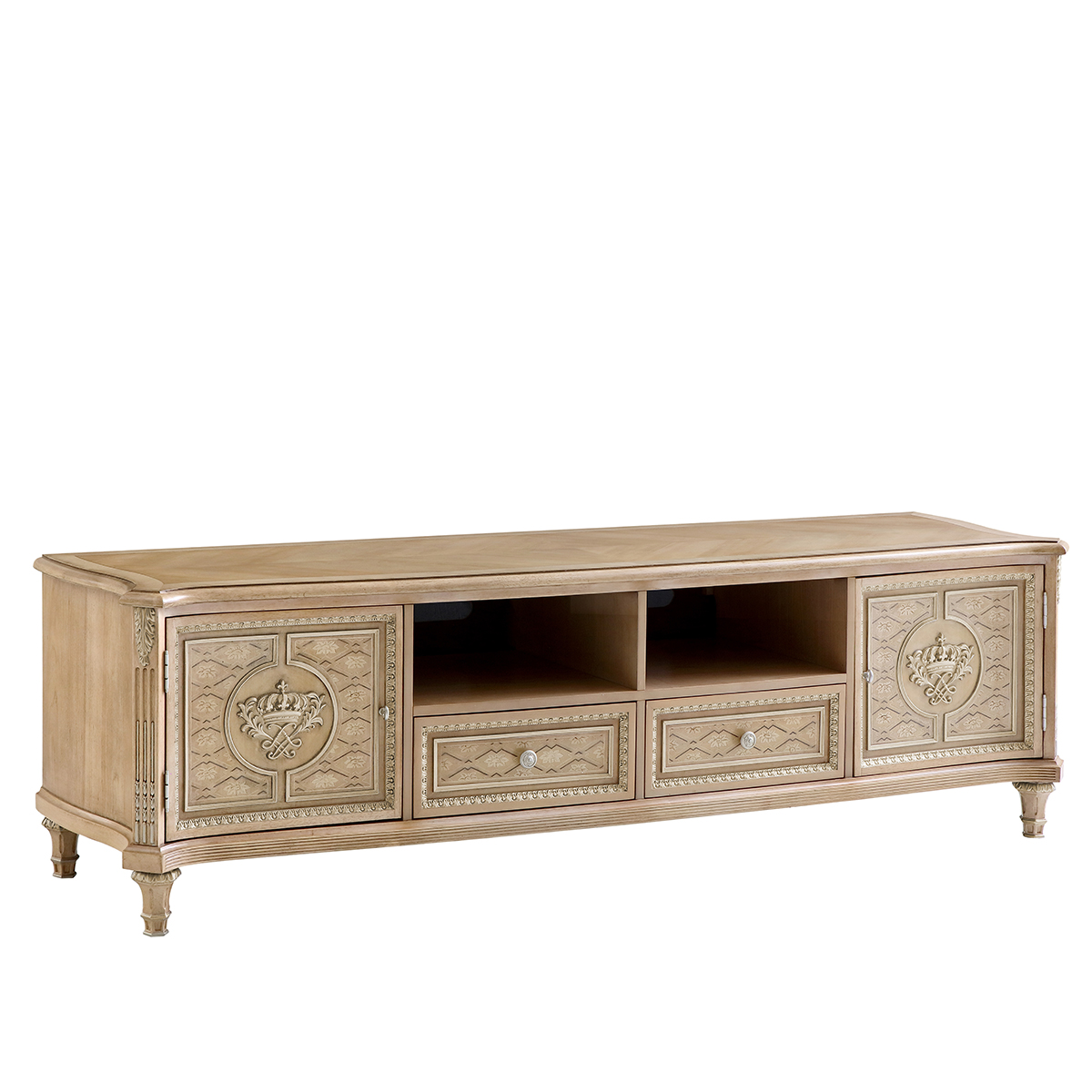 凡爾賽玫瑰電視柜 以 Louis路易時期 Bombe Chest(邦貝柜)新古典風格為設計靈感,多種珍稀木皮貼飾成的木皮拼花清晰美觀,斗面鑲嵌路易十四太陽王的“L”字圖騰雕刻,沐浴著太陽之光象征王權榮耀,