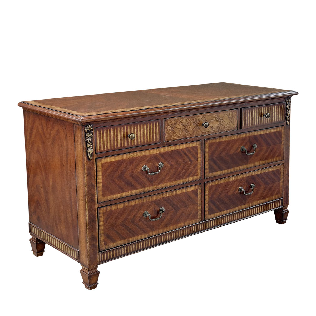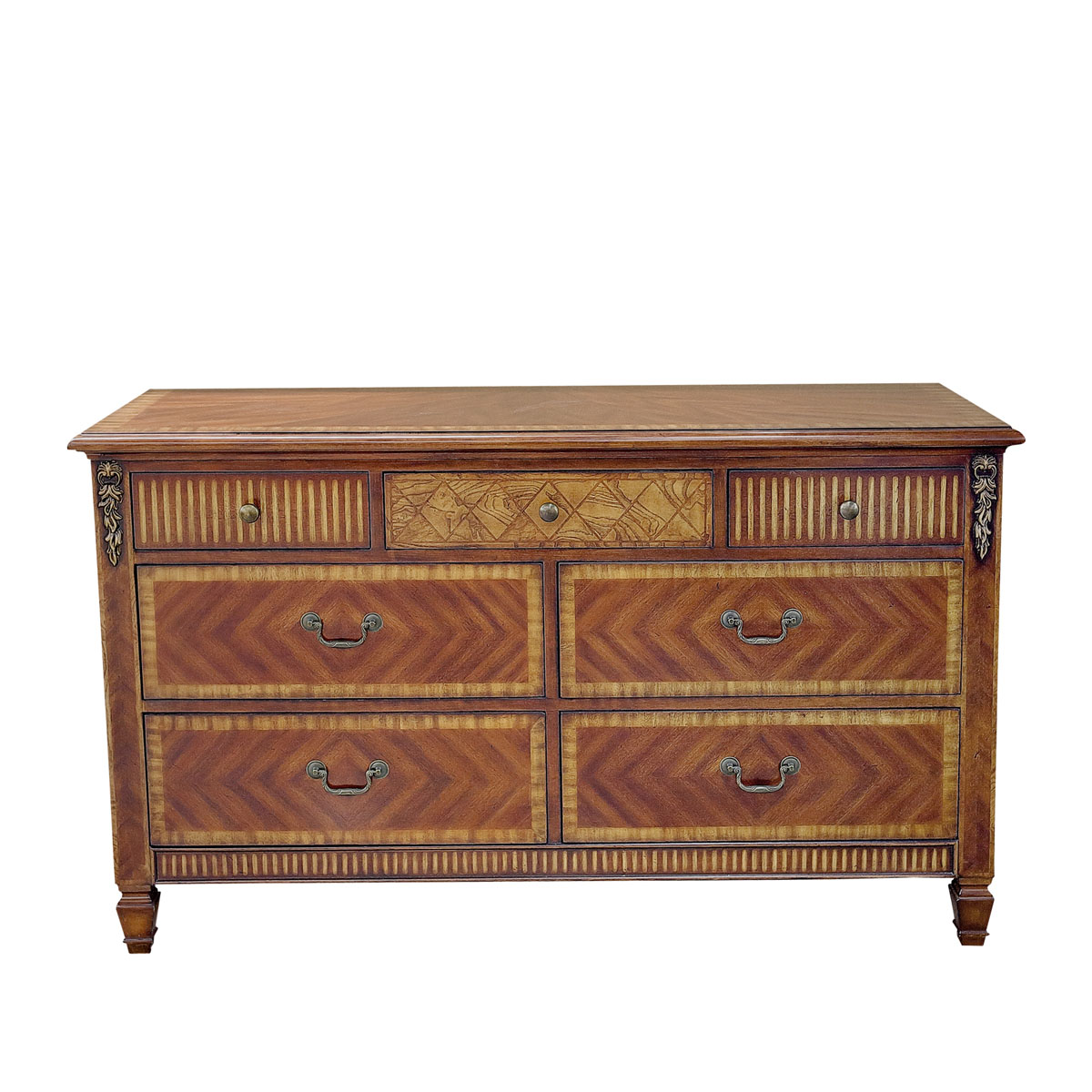 * 手工木皮拼貼工藝 * 七個儲物抽斗,上面中間抽斗可翻下抽斗面(兩側裝有消聲鐵滑軌),可放DVD電器,背板有通線孔; * 腳底部裝有可調腳釘;