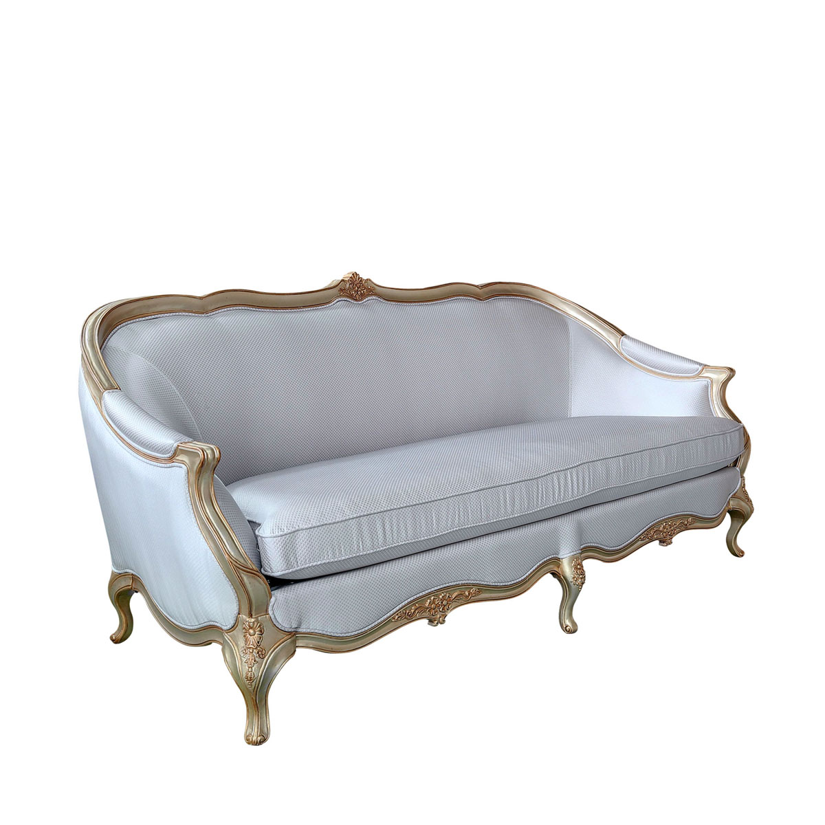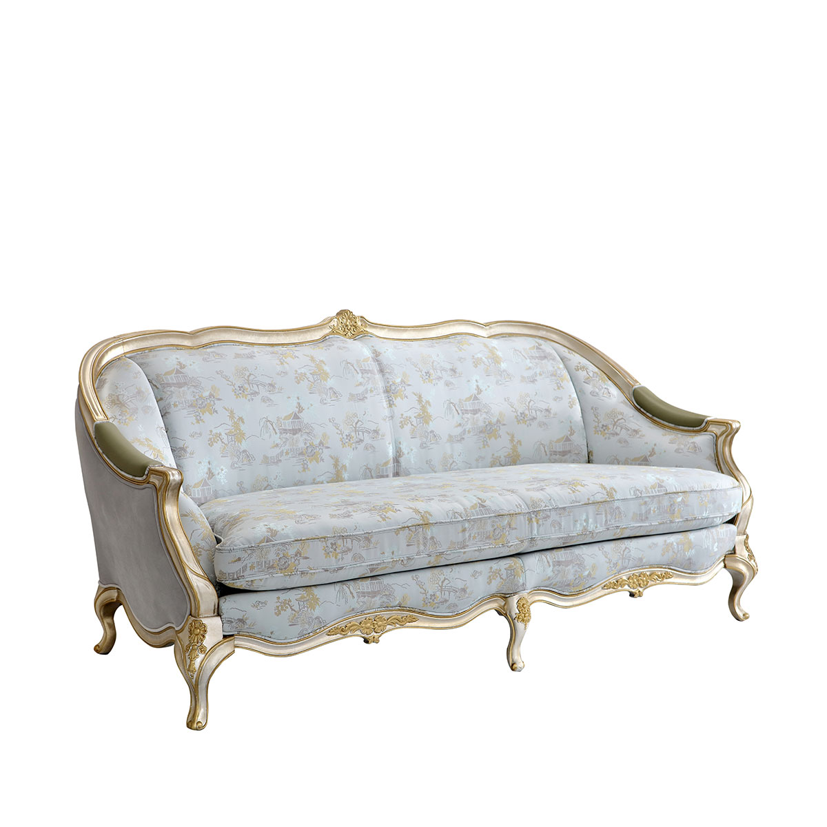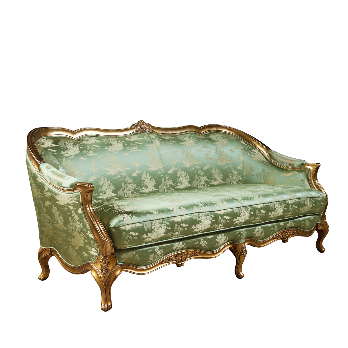 * 從法國十八世紀初攝政時期的風格中汲取靈感制作而成,采用了同風格的彎腳設計,阿坎瑟斯葉雕刻造型和金箔貼飾,再飾以繁花綻放圖案的絲綢和包有豐厚的填充物坐墊和靠背,使得這款沙發閃耀著華麗高貴的光環。