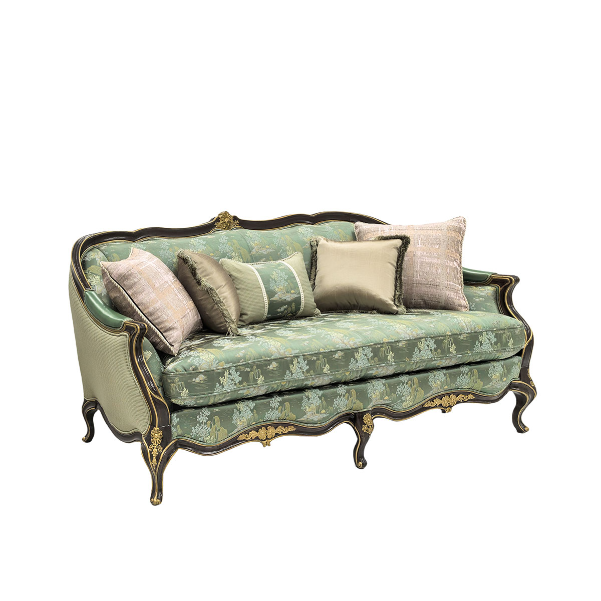 * 沙發外形布滿手工實木雕刻的花環和卷葉圖案 ; * 6只彎形雕刻腳 * 沙發前方、坐墊及背部包有豐厚的填充物 ; * 扶手設計源于法式經典翼背椅(Wing Back Chair) ;