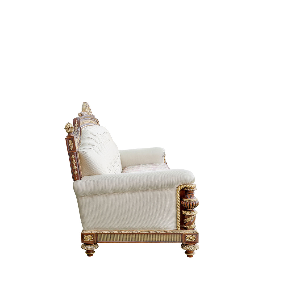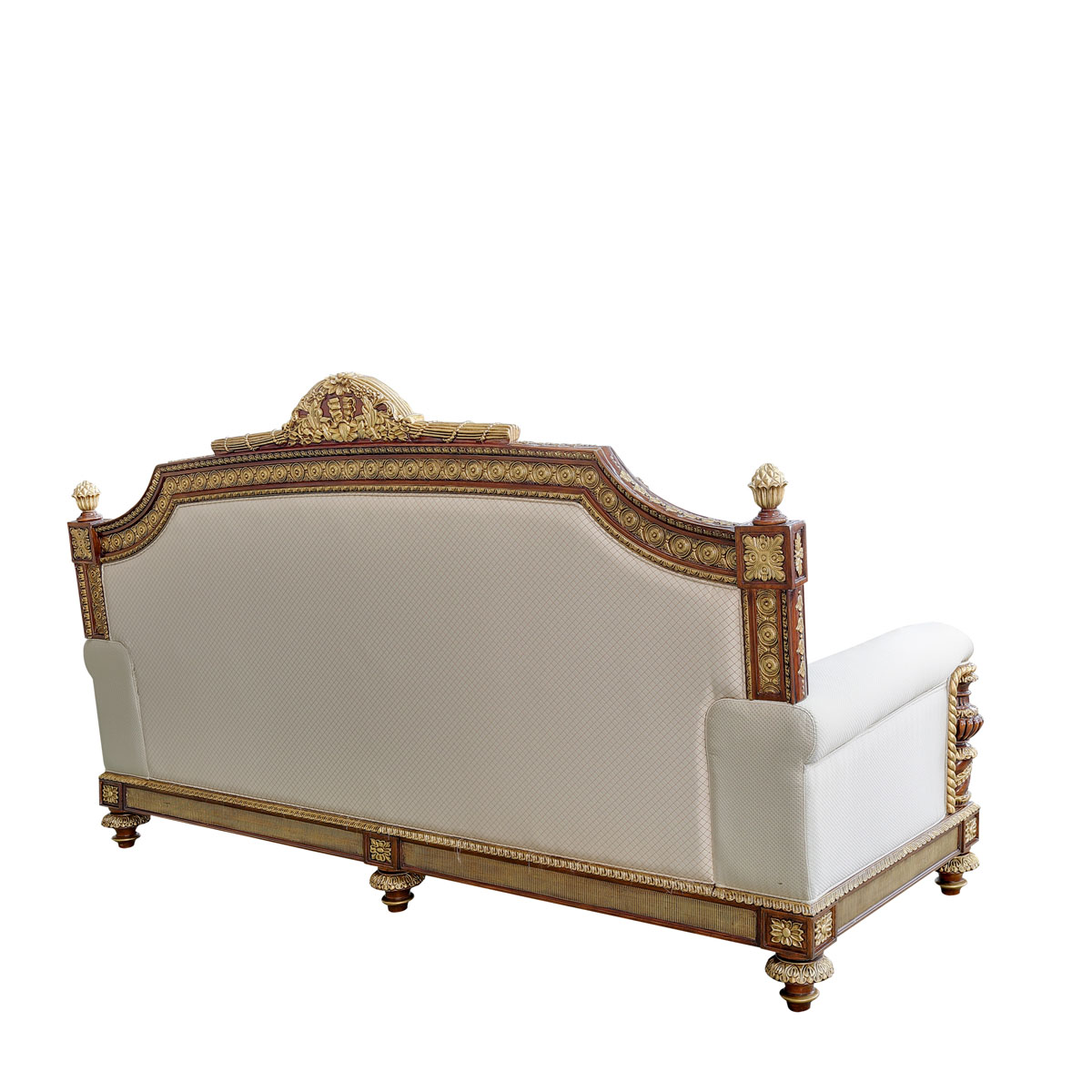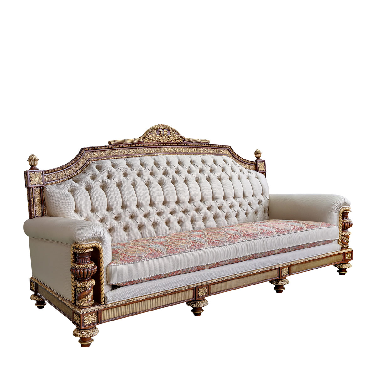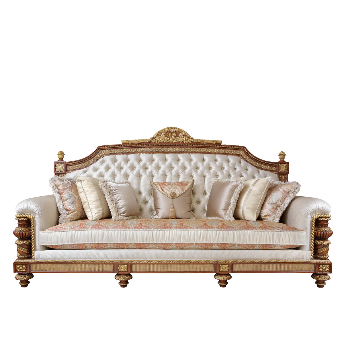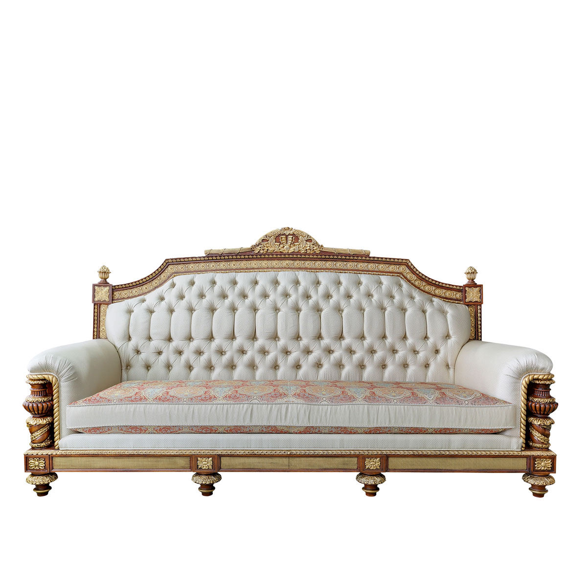 * 以英國溫莎城堡中喬治四世時期的臥床為設計意念,使用皇家御用的桃花心木為主要材質,配以精致的雕刻和貼金工藝,表達英國皇室尊貴的地位。同時使用舒適的軟包和柔順的布藝,使藝術和生活結合,表達英國君王客廳應有的品質,是溫莎堡系列英式沙發(fā)的特色。